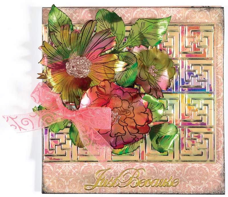 Stamp Fresh Cut large, medium and small flowers on pink and gold Gemstone Shimmer Sheetz and leaves on green. Cut out the images and heat with the heat gun until curled. Zot three sizes of flowers to the left side of the card as shown.