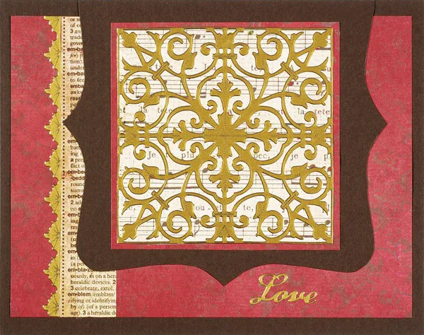 Place a large Dazzles™ gold quilting block on Roses in Harmony music note paper and cut around the edges. Mat Dazzles™ on red swirls paper with 1/16” edges then glue centered on the label. Place a “Love” Dazzle™ below the label as shown.