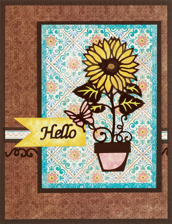 Place the Sunflower Dazzles™ on a 3”x4 1/2” piece of Soft Nostalgia tile paper. Mat on Soft Nostalgia teal paper, then again on brown cardstock. Glue as shown then place the border Dazzles™ at each side, below the stripe.