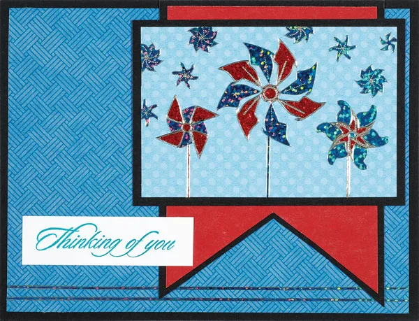 Stamp “Thinking of You” in Prussian Blue chalk ink on white cardstock. Glue below the Pinwheel Dazzles™ as shown.