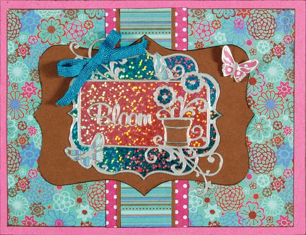 Trace a 3 ½”x4 ¾” Bracket Label onto brown cardstock. Cut out and ink the edges brown. Glue to the center of the card. Line the flower pot inside the Dazzles? frame with brown cardstock, the flower blossoms with blue holographic paper and the butterflies with striped paper. Line the center of the frame with pink holographic and the entire frame with blue holographic. Glue to the brown label and place the “Bloom” greeting inside the frame.