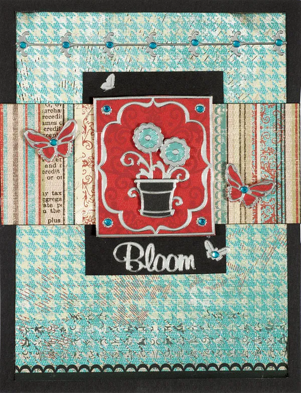 Place the silver frame on patterned red paper and place the flowerpot sticker at the center. Line 2 blossoms with blue and the pot black. Foam tape over the flowerpot sticker. Place silver dots on each corner of the frame with crystals centered on top. Foam tape the rectangle centered on the back rectangle.
