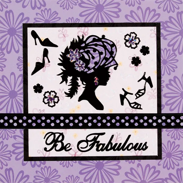 Place the polka dot Dazzles™ border on Purple Daisies paper and cut next to the Dazzles™ edge. Glue 1 1⁄2" from the bottom. Place the “Be Fabulous” Dazzles™ below. Back a lady silhouette on Purple Daisies paper and use a small scrap of purple holographic to back her earring. Cut next to the Dazzles™ edge. Place purple flower Dazzles™ on the hat and glue her in the center of the card. Place flower and shoe Dazzles™ as shown.