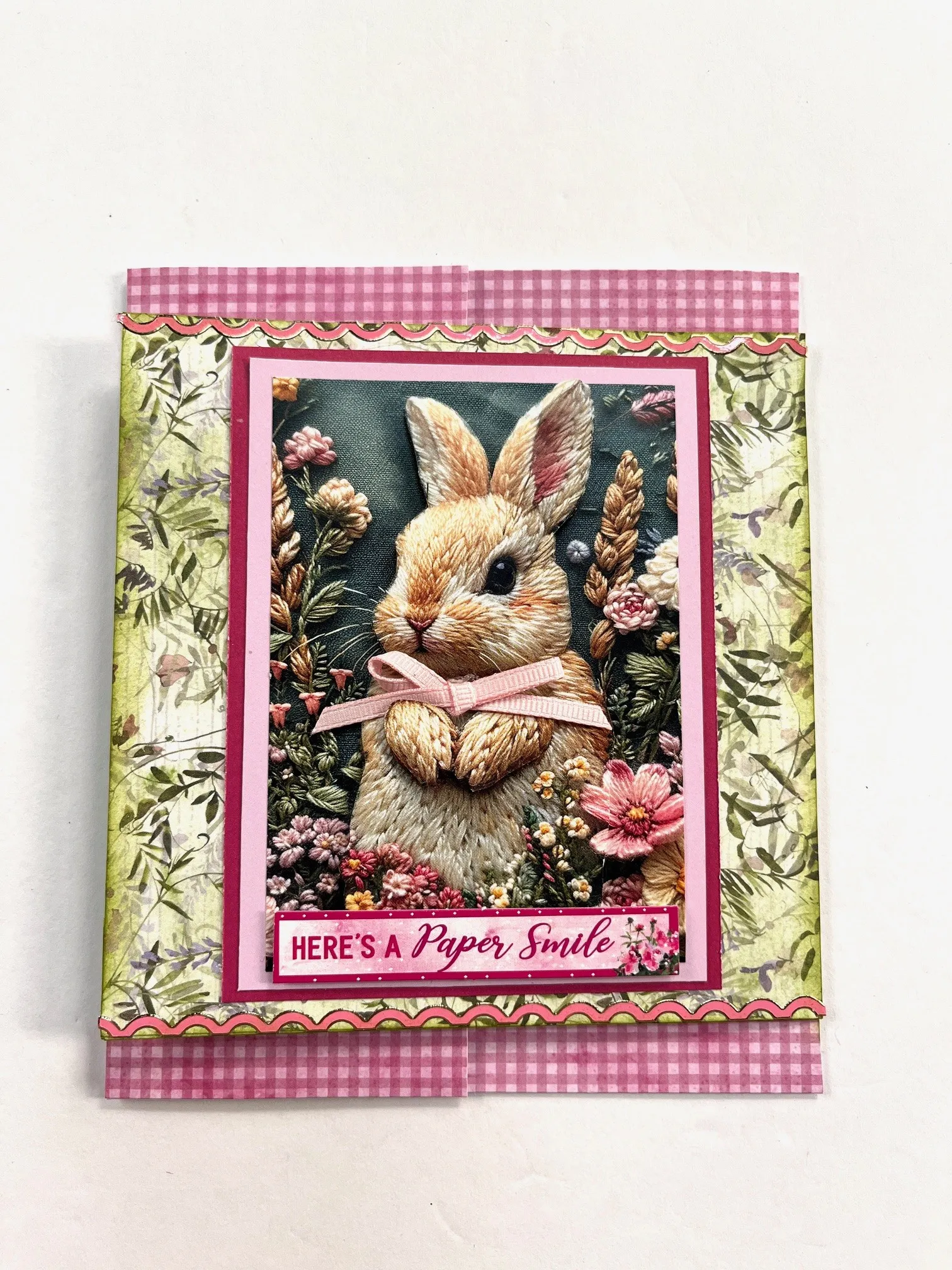 4. Open the card and cover the left side with pink gingham Wildflowers & Wildlife 6x6 Patterned Cardstock. Glue 2 ½”x4½” leaf patterned in the center. Place pink border Dazzles™ on the top and bottom. Glue the bunny Die-Cut in the center.