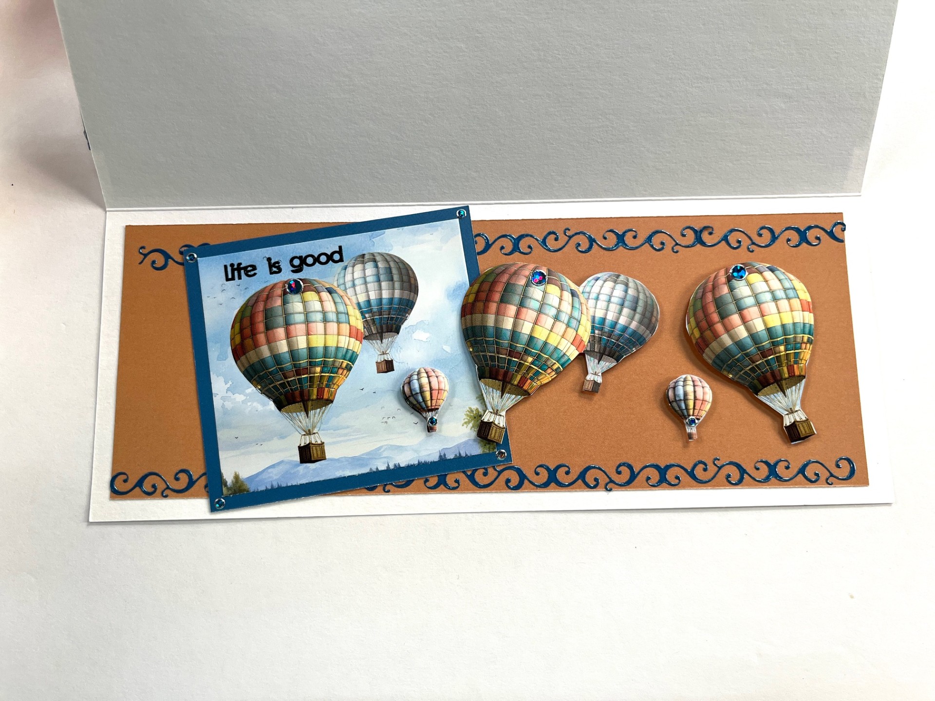Card inside: Tape 8”x3” dark tan Solid cardstock to the card inside with 1/4” white borders all around. Place blue Fancy Border Dazzles™️ along the top and bottom. Cut a 3” square of the hot air balloon page and mat on blue Solid cardstock leaving 1/8” blue border. Tape at an angle as shown. Cut out the remaining balloons and foam tape as shown. Place teal jewel Dazzles™️ as shown.