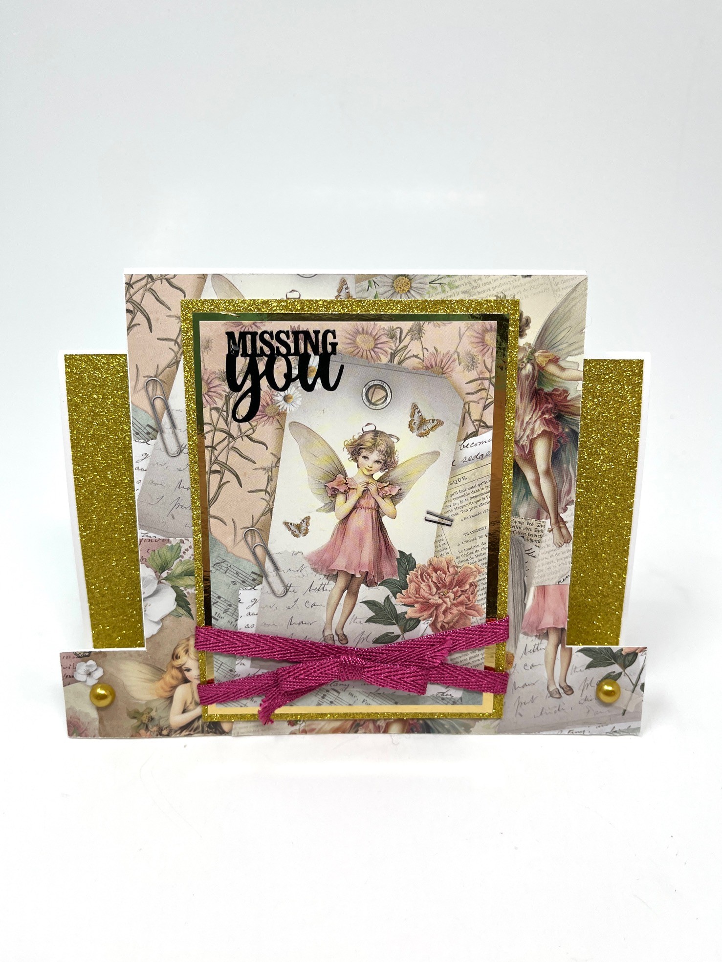 Cover the center card area with adhesive and place the 3 pink fairy pages to create a collage covering the area, trim off the excess. Mat the pink tag fairy page on gold Mirri leaving 1/8” borders. Mat on gold glitter cardstock leaving 1/8” borders. Wrap pink glimmer ribbon around the bottom and foam tape to card front. Make and Zot™️ a 2” wide pink bow from the Glimmer Ribbon Set and place where the two ribbons intersect. Place pearls as shown. Place “Missing You” We’re Together Dazzles™️ on the top left. Tape a 3/4”x 3 3/4” gold glitter cardstock to the right and left sides leaving 1/16” white borders.
