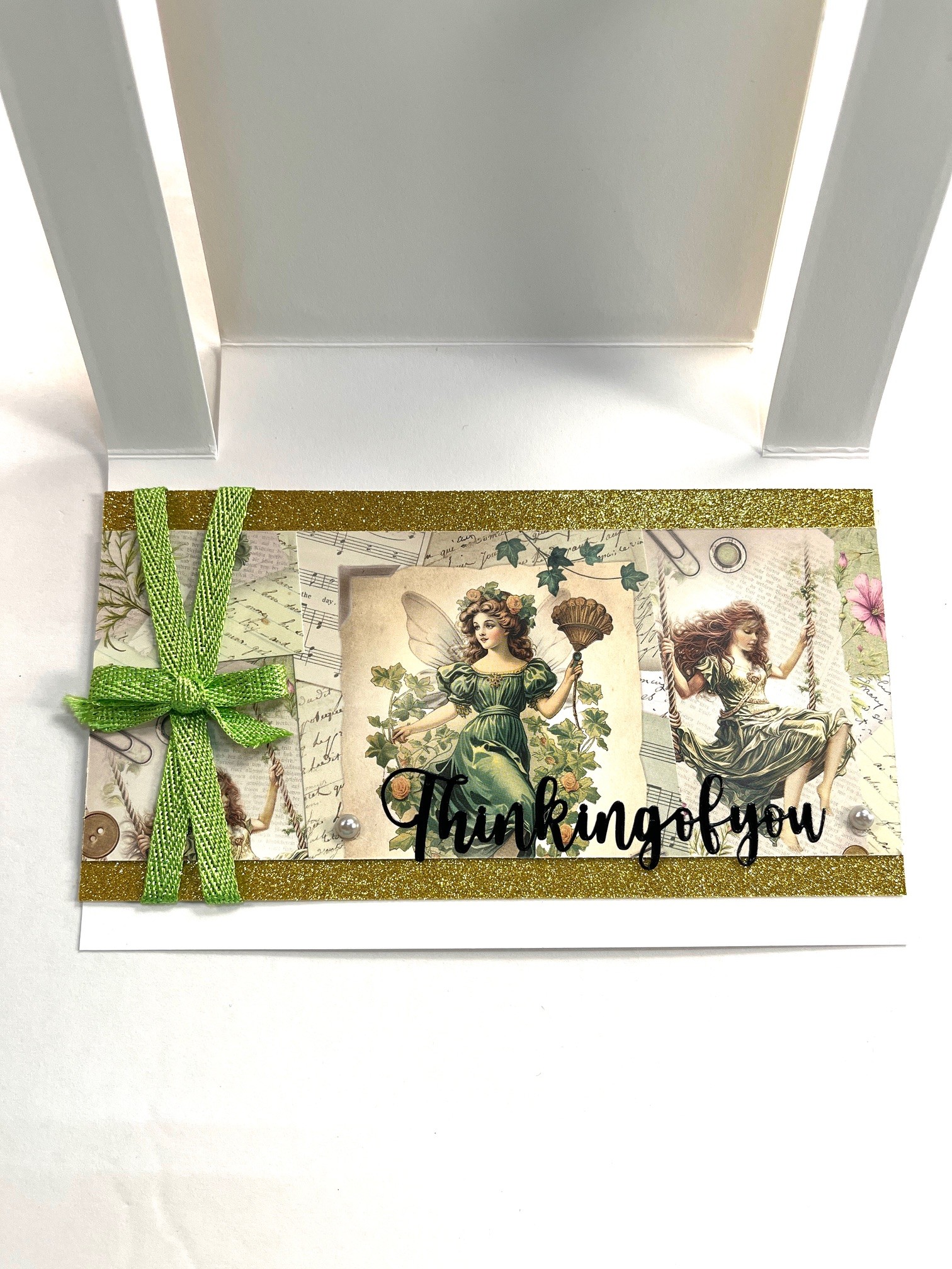Card Inside: Cut 6 ¼”x2 5/8” cardstock. Cover with tape and place green fairy sheets to cover it; cut off the excess. Mat on gold glitter cardstock leaving 1/4” top and bottom borders. Wrap green glimmer ribbon at the left end as shown. Tape to the card base. Make and Zot™️ a 2” wide pink bow from the Glimmer Ribbon Set and place where the ribbons intersect.