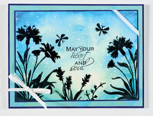 Stamp wildflowers with black StazOn® along the bottom edge as shown. Stamp “May Your Heart and Soul” on the center with dragonflies above, as shown. Mat on Iris suede with a 1/16” border. Wrap white ribbon around the upper right and lower left corners and tie in a bow as shown.