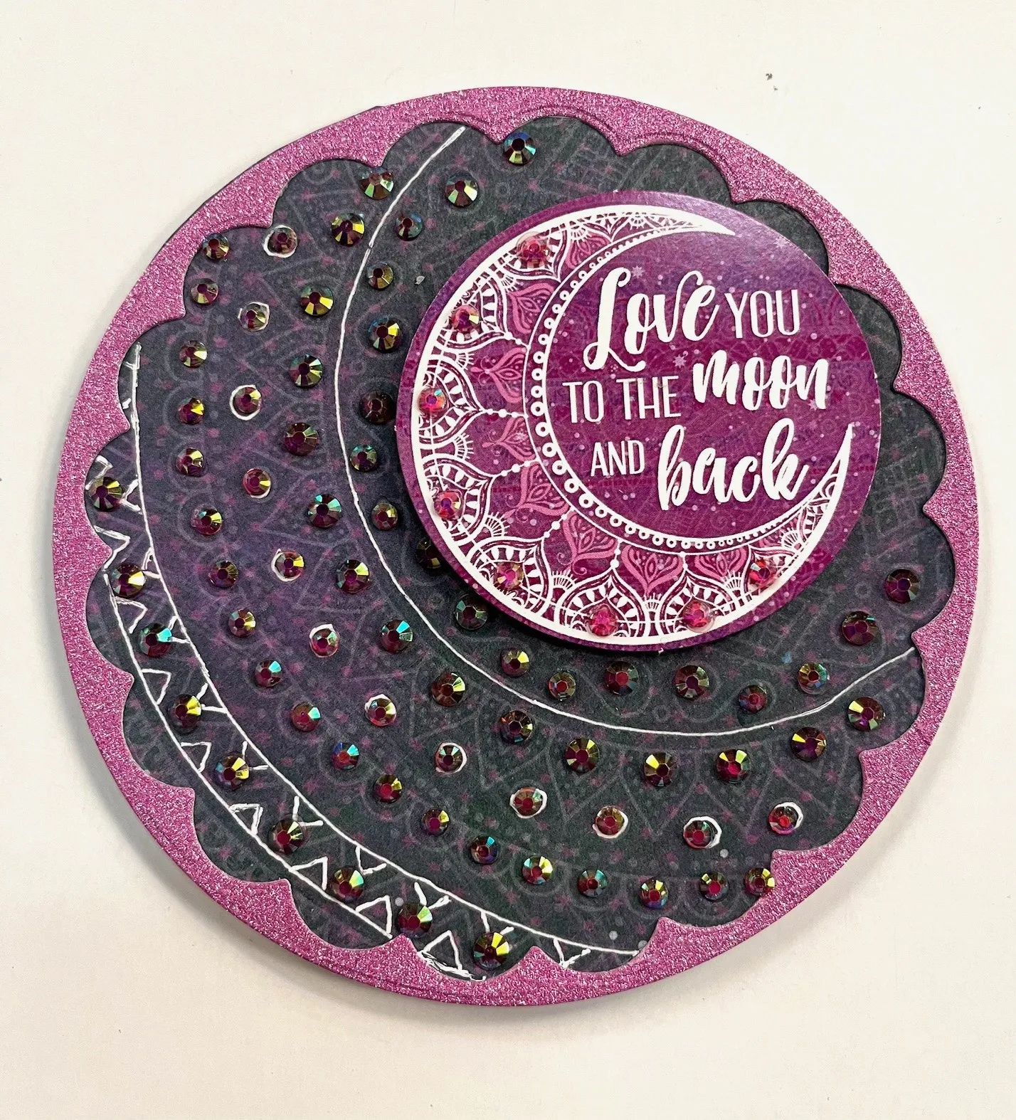 2. Place the 5 1/8” Circle on the Rose Pink Glitter cardstock with the 4 7/8” scallop circle inside. Die cut the shapes—you’ll have a scalloped circle and a frame. Glue the frame over the card front and save the circle for inside the card.