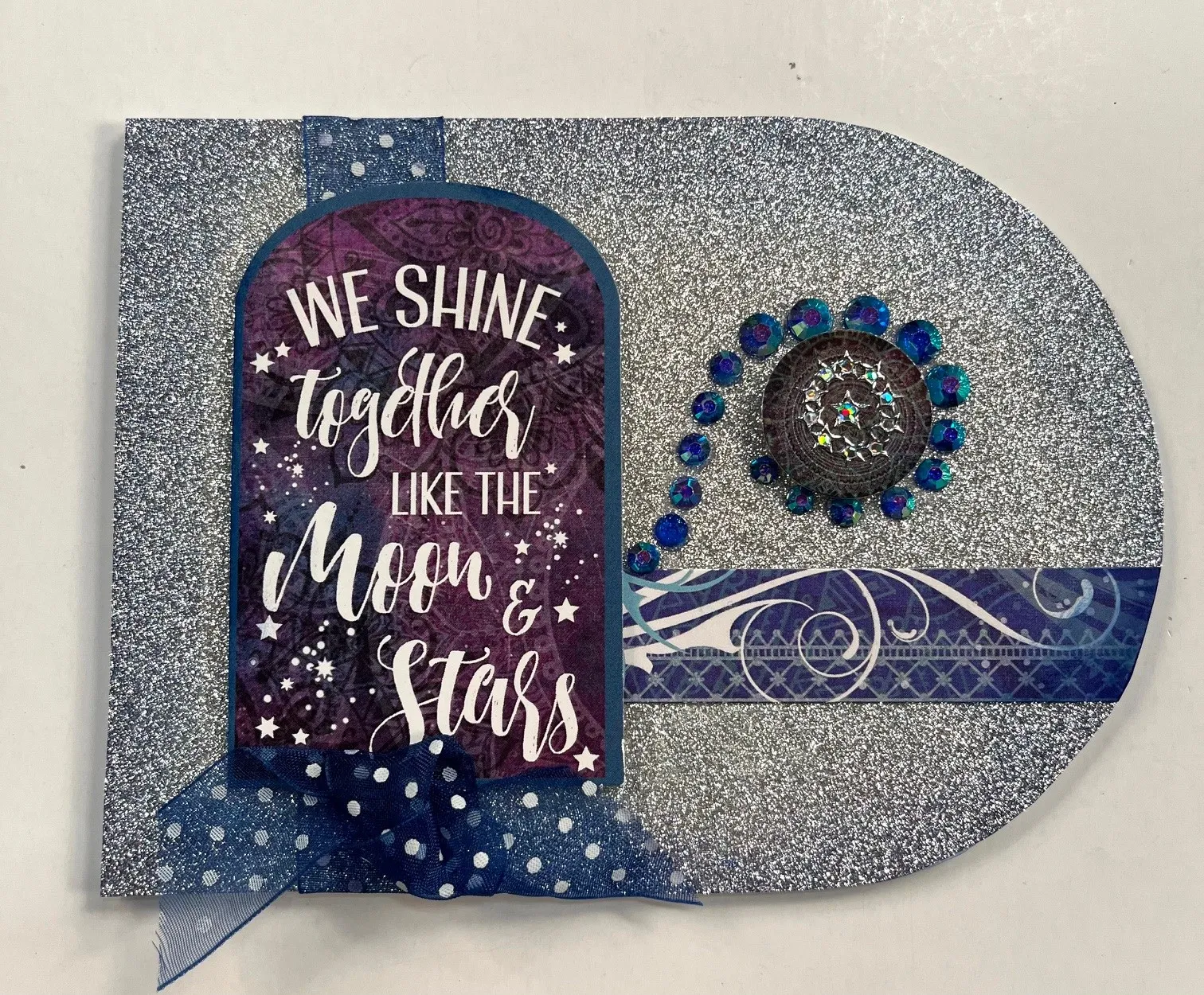 3. Select the Blueberry Crystalz you want to use. Place tiny drops of Specialist glue where the Crystalz will go. Use the Jewel Picker to place them. Place Star Dazzles™ on the circle as shown. Knot the Blue ribbon and Zot™ under the “We Shine” die-cut.