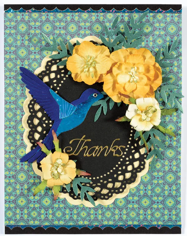 Die cut the 3 5/8”x4½” Oval Doily from black cardstock and the mat from ivory cardstock. Glue the doily to the mat and glue to the card center. Die cut the hummingbird wing and back with Iris Suede and under the wing and body with Blue Fireworks Holographic paper. Use a glue stick to assemble and place a tiny Black Jewel Dazzles™ for the eye. Color the beak with black pen. Glue the bird to the left side of the oval as shown.