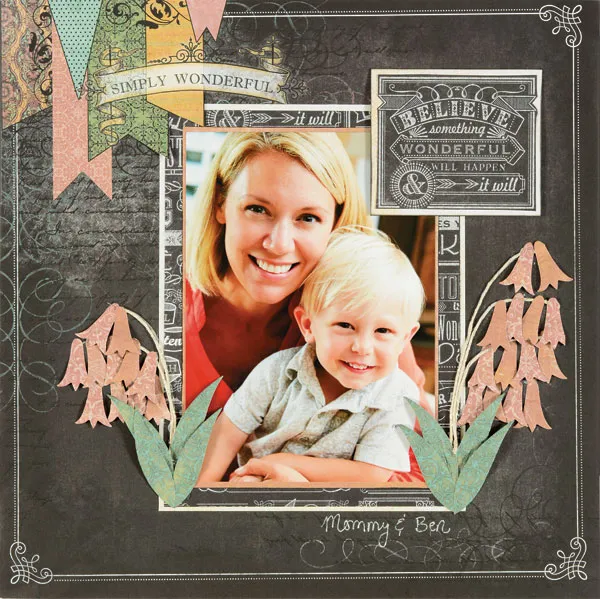 Mat the 5”x7” photo with Chalkboard peach paper, leaving a 1/16” border and mat on Chalkboard text paper, leaving a ½” border. Mat again on Chalkboard ivory paper, leaving a 1/8” border. Use the X-acto® knife to cut the bottom of the green and gold banners on the Chalkboard “Simply Wonderful” paper. Slide the matted photo under the cutaway portion of the banners and glue as shown.