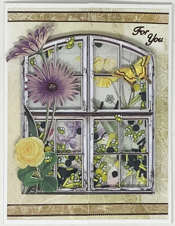 4. Glue the purple daisy and small yellow rose die-cuts to the window on the left side. Glue the small yellow butterfly to the window in the upper right corner. Glue three bees on the window as shown. Place brown “for you” Dazzles™ on the card at the upper right.