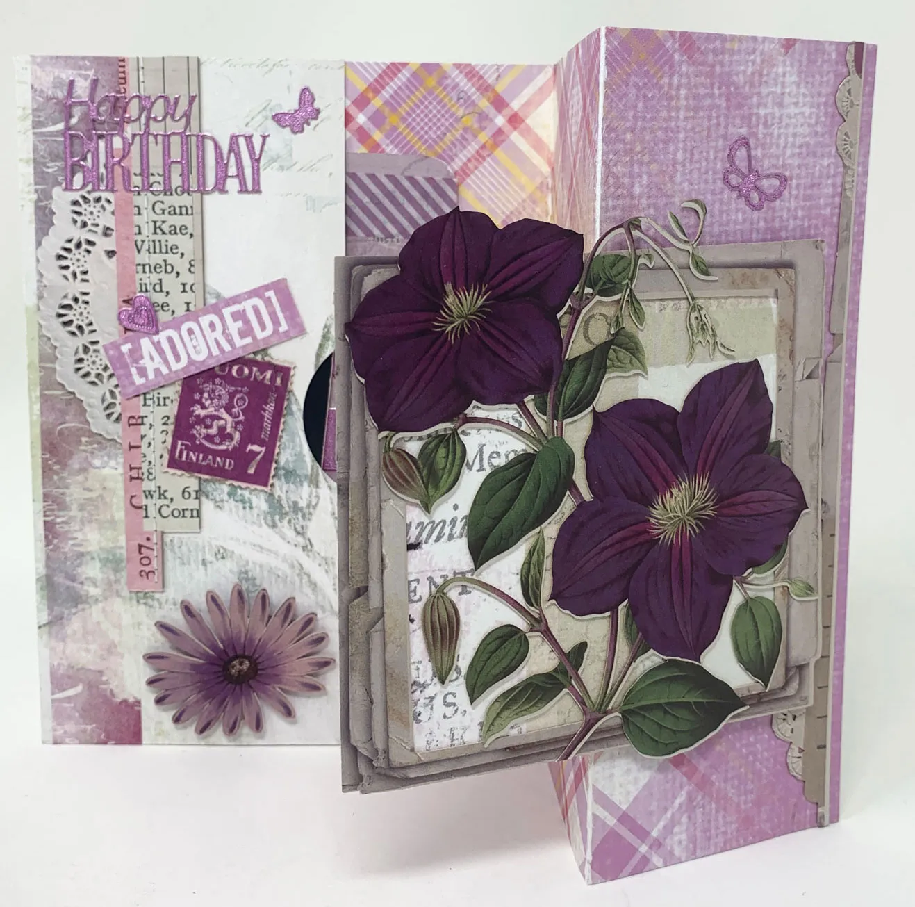 4. For the front flap: Pull the folded right flap over the card inside. Trim the narrow lacy border die-cut to 6½", then glue it near the right flap edge. Cut a 3¼"x3¼" Vintage Artistry white/tan text section of cardstock and glue it behind the opening of the 3¾"x3½" frame die-cut. Foam tape the right half of the frame to the flap, centering it on the card. Glue the dark purple flowers to the frame and place a pink pearl butterfly Dazzles™ above it as shown.