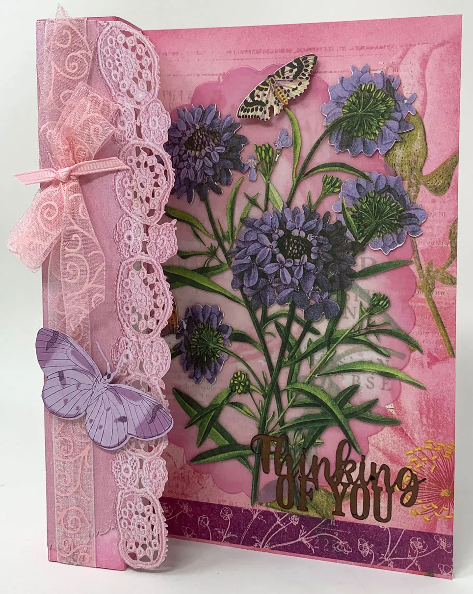2. For the large panel: Die cut a 5½" tall scalloped oval from vellum and ink the edges. Glue it to the large panel ½" from the right edge. Place purple washi tape along the bottom, trimming the excess. Trim the tan moth from the large purple bouquet, then glue the bouquet over the oval. Foam tape the tan moth near the card top and place brown “thinking of you” Dazzles™ near the bottom as shown.
