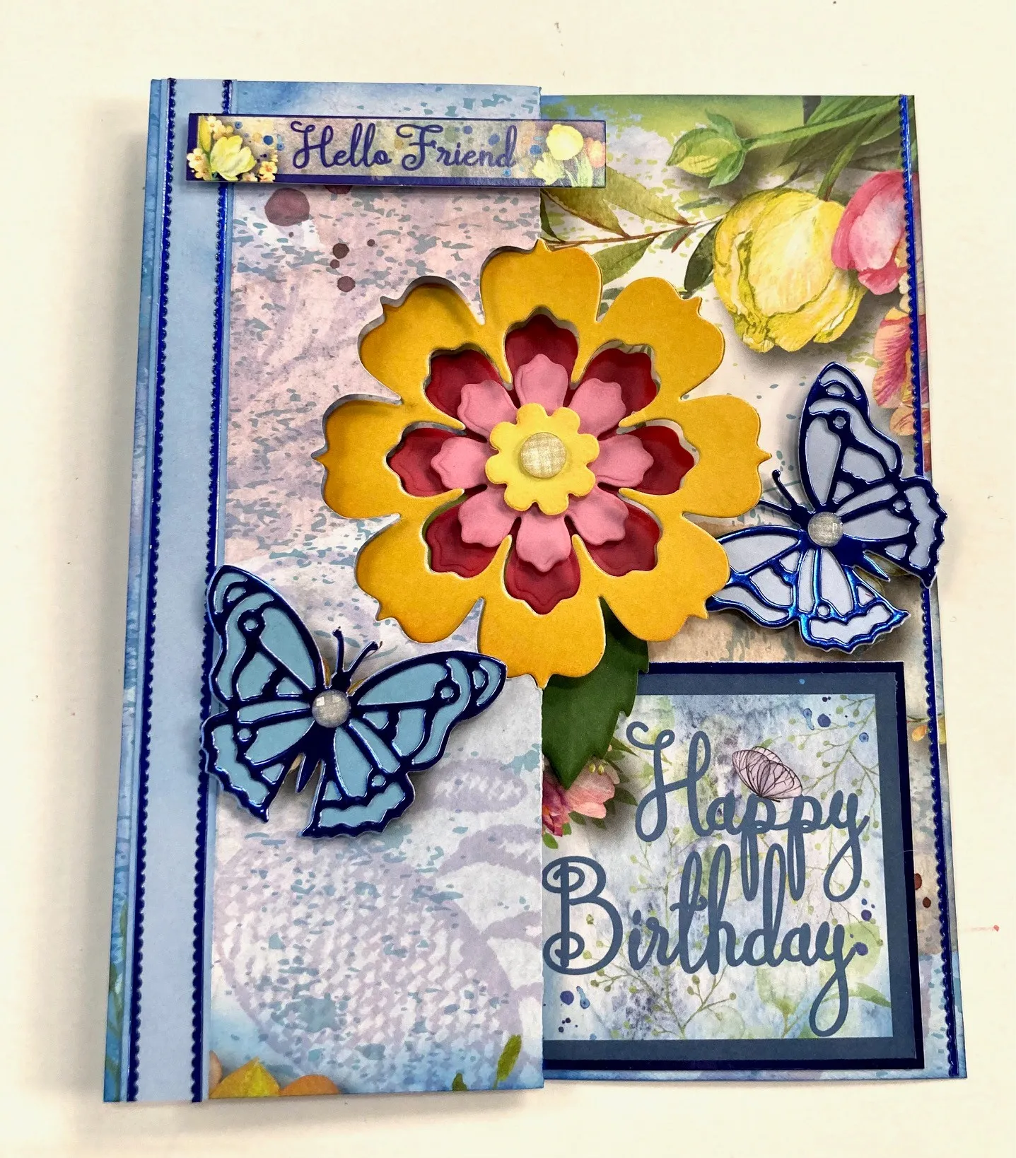8. Die cut a 2" and a 1½" openwork butterfly from Mirri and the matching solid butterflies from blue cardstocks. Glue the layers together, then glue and foam tape them to the inside as shown. Place light Diamond Sparkles on the butterfly bodies and in the yellow flower center.