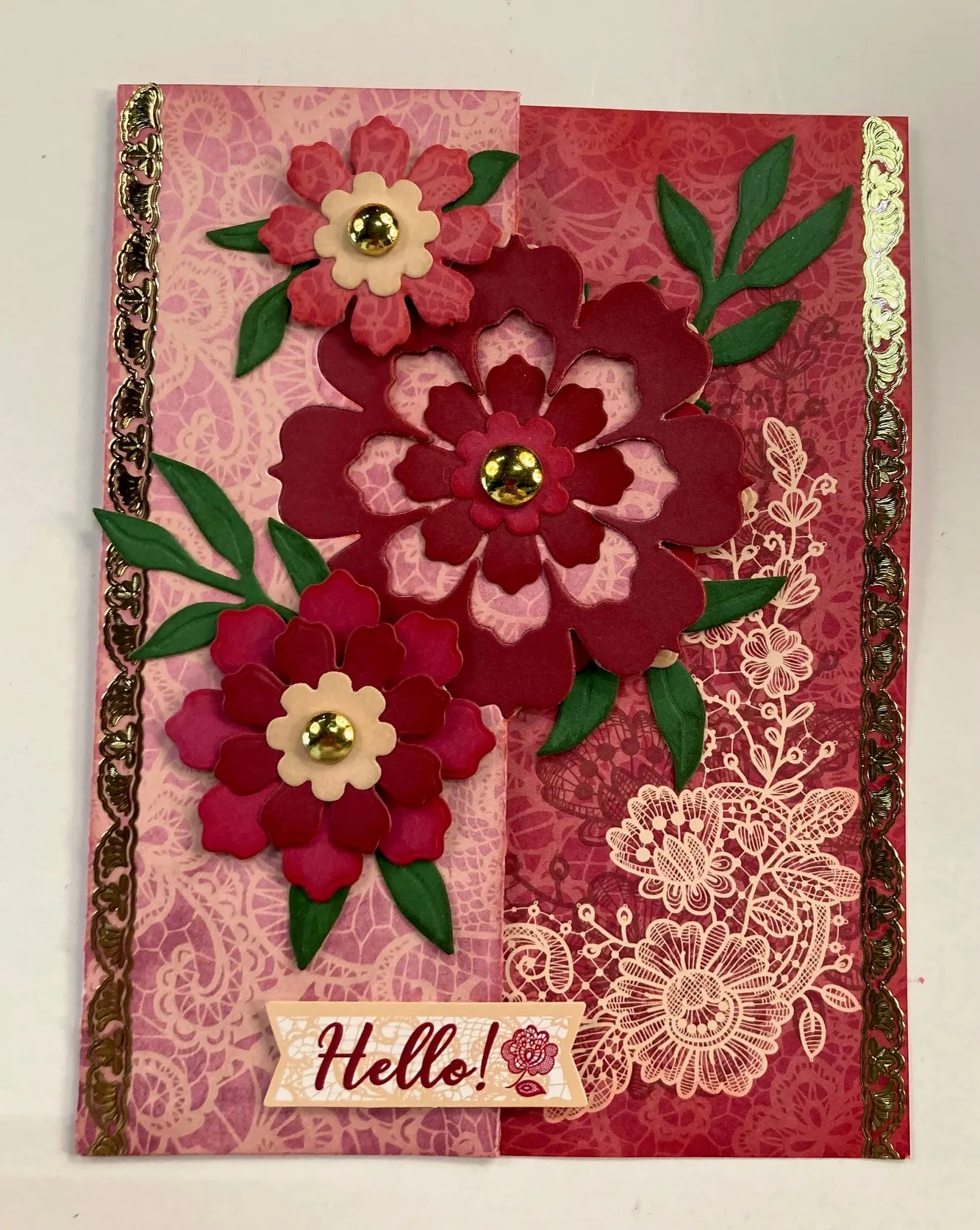 3. Use the double-flower die to cut maroon flowers and ink the edges with Red Earth. Glue the outer flower to the flipped flower section on the front, aligning the edges. Place a gold border Dazzles™ near the left edge, trimming the excess. Foam tape the “hello” die-cut extending off the folded edge near the bottom.
