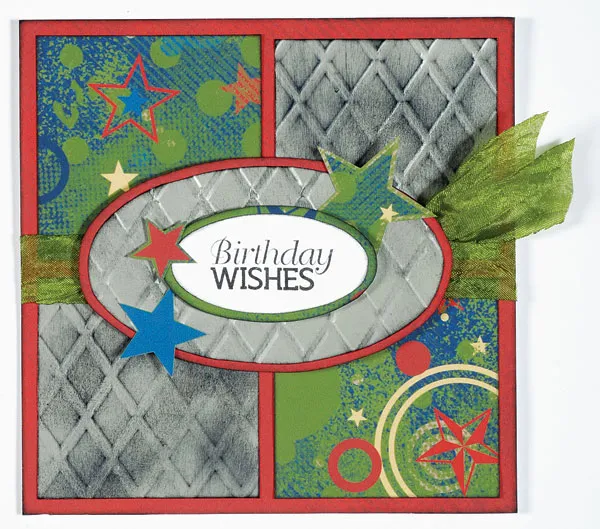 Stamp “Birthday Wishes” onto the white cardstock scraps you saved from step Trace a 2”x1” oval around the greeting and cut out. Erase any pencil lines. Ink edges and mat on green, leaving a 1/8” border. Foam tape to the center of the card.
