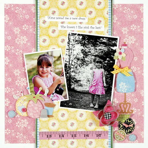 Glue a 6 1/2”x12” piece of yellow doily paper and glue 1 5/8” form the left side of a piece of white cardstock. Unzip yellow zipper trim and glue each half to the back long edges of a 12”x8 1/2” blue gingham. Glue across the page, 1 1/2” from the bottom. Glue a length of pink measuring tape 1/2” from the top zipper edge.