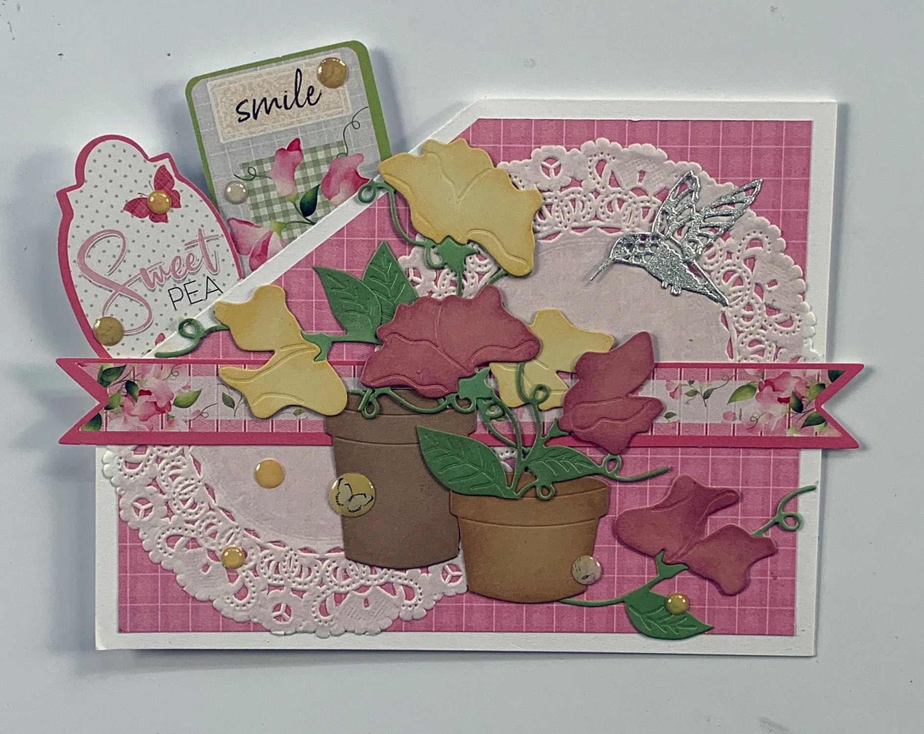 Die cut a left flying hummingbird from the silver sparkle sheet and adhere it at the upper right. Punch out the “sweet pea” and “smile” labels and use 2-sided tape to attach them to extend above the angled edge at the upper left corner. Place wishing bubbles over the labels and card front as shown.