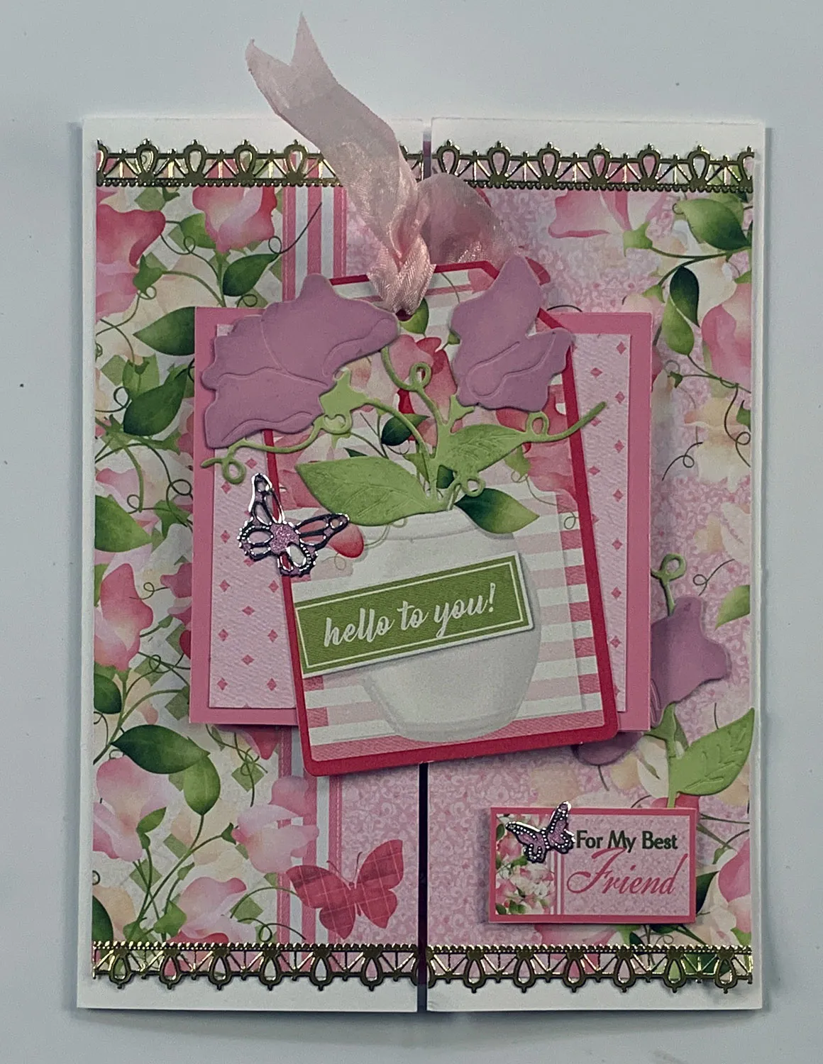Cut out the Sweet Pea “for my best friend” label and foam tape it at the lower right, over the flower stem. Place a ½" pink butterfly Dazzles™ on the sentiment.