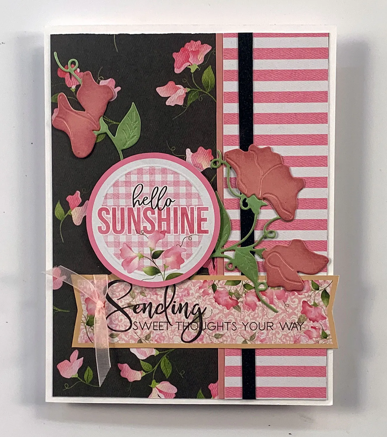 For the card front: Cut 4¾"x6¼" Sweet Pea black floral cardstock. Cut 1¾"x6¼" Sweet Pea pink striped cardstock and ¼"x6¼" Black shimmer cardstock. Glue the shimmer strip to the striped cardstock, ¼" from the left edge. Mat the left long edge of the striped piece on pink cardstock with a 1/8" border, then glue the striped cardstock to the black floral cardstock, aligning the right edges. Glue the cardstock centered on the card front.