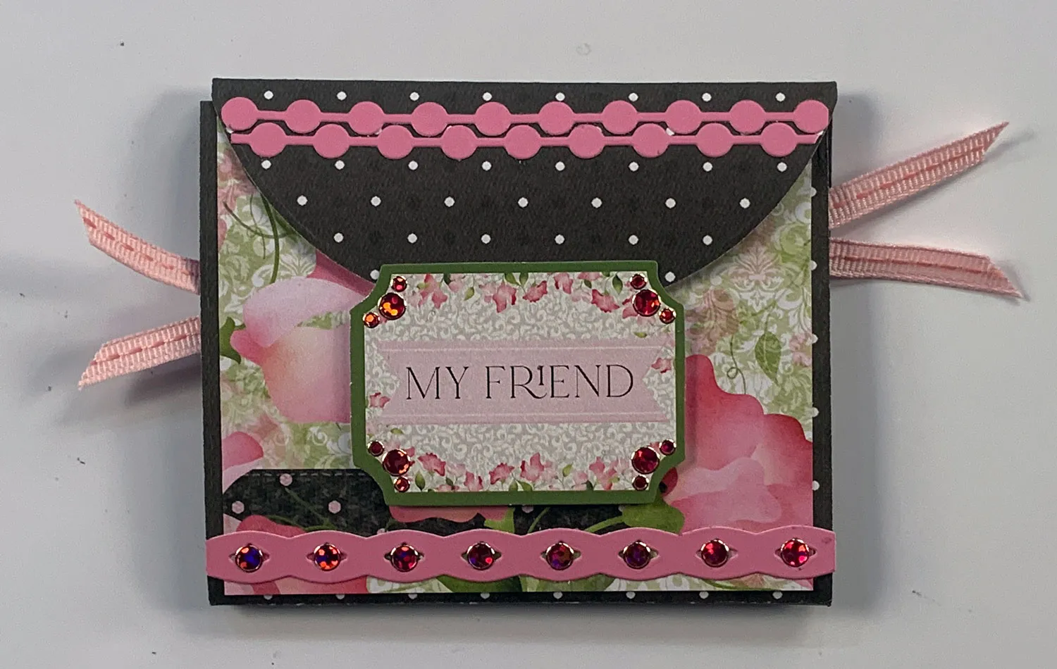 Cut 4"x3¼" Sweet Pea green floral paper with the black ribbon border along the bottom and glue it to the front panel. Die cut a scalloped border from pink cardstock, cut a 4¼" length, and glue it near the bottom. Punch out the Sweet Pea “my friend” label and put foam tape just on the lower half. Adhere it to the panel, ¾" from the bottom, then decorate the label and border with jewel Dazzles™.