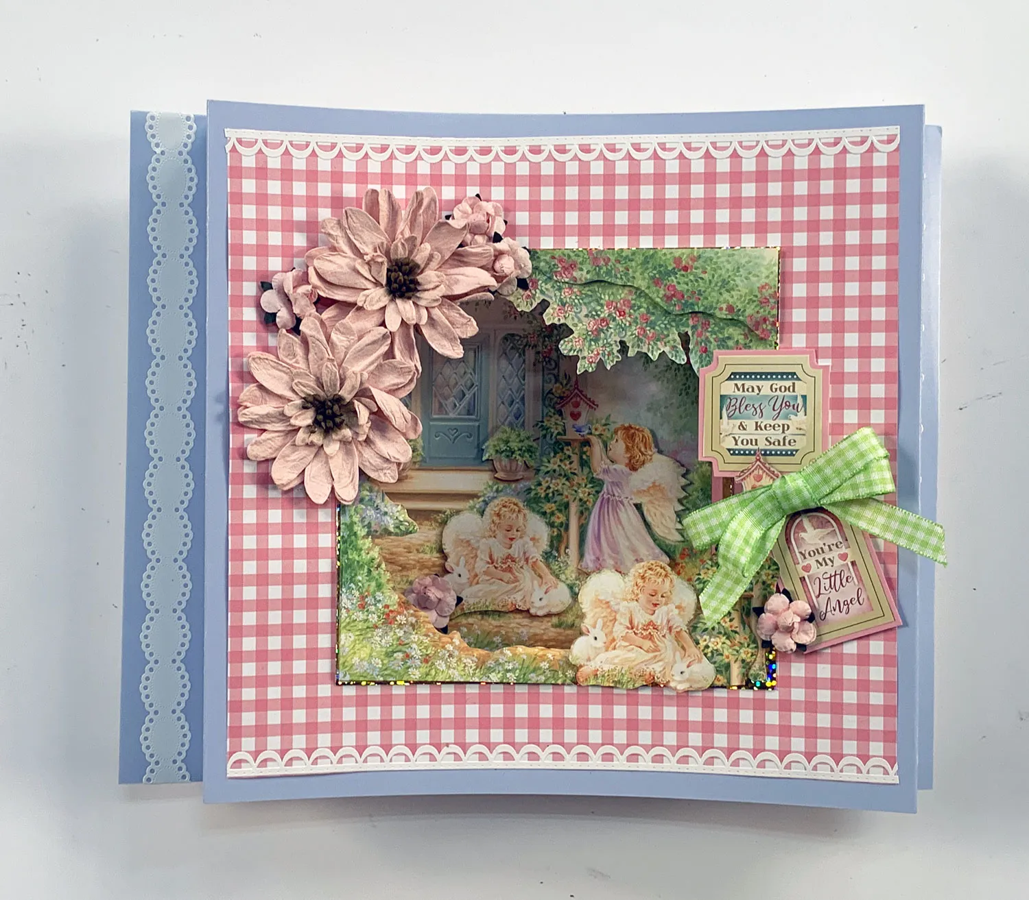 Cut two pale blue Adorable Scorable sheet each to 7 1/2” to 11 1/2”. Have the colored side up and score each short side at 1” then 2” and do the same to the other end. For the bottom piece: Glue 7”x7” light pink large gingham to the center. Mat the angels with bunnies and birds paper, from the Little Book of Little Angels, on pink Adorable Scorable with 1/8” borders. Mat again on Gold Sparkles holographic with 1/8” borders. Glue to the center of the gingham. Cut out both angels and two potted plants the images from the angel paper and foam tape on top of the first images.