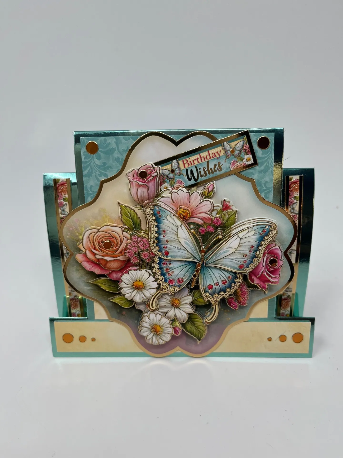 Foam tape the layers of the Flutterby Wishes sheet, leaving a bottom layer, a butterfly, and some flowers for the inside. Tape the completed piece to the base layer then attach turning it on point in the center of the card. Place copper Jewel Dazzles™️ on corners, and butterfly body. Attach “Birthday Wishes” into top flowers.