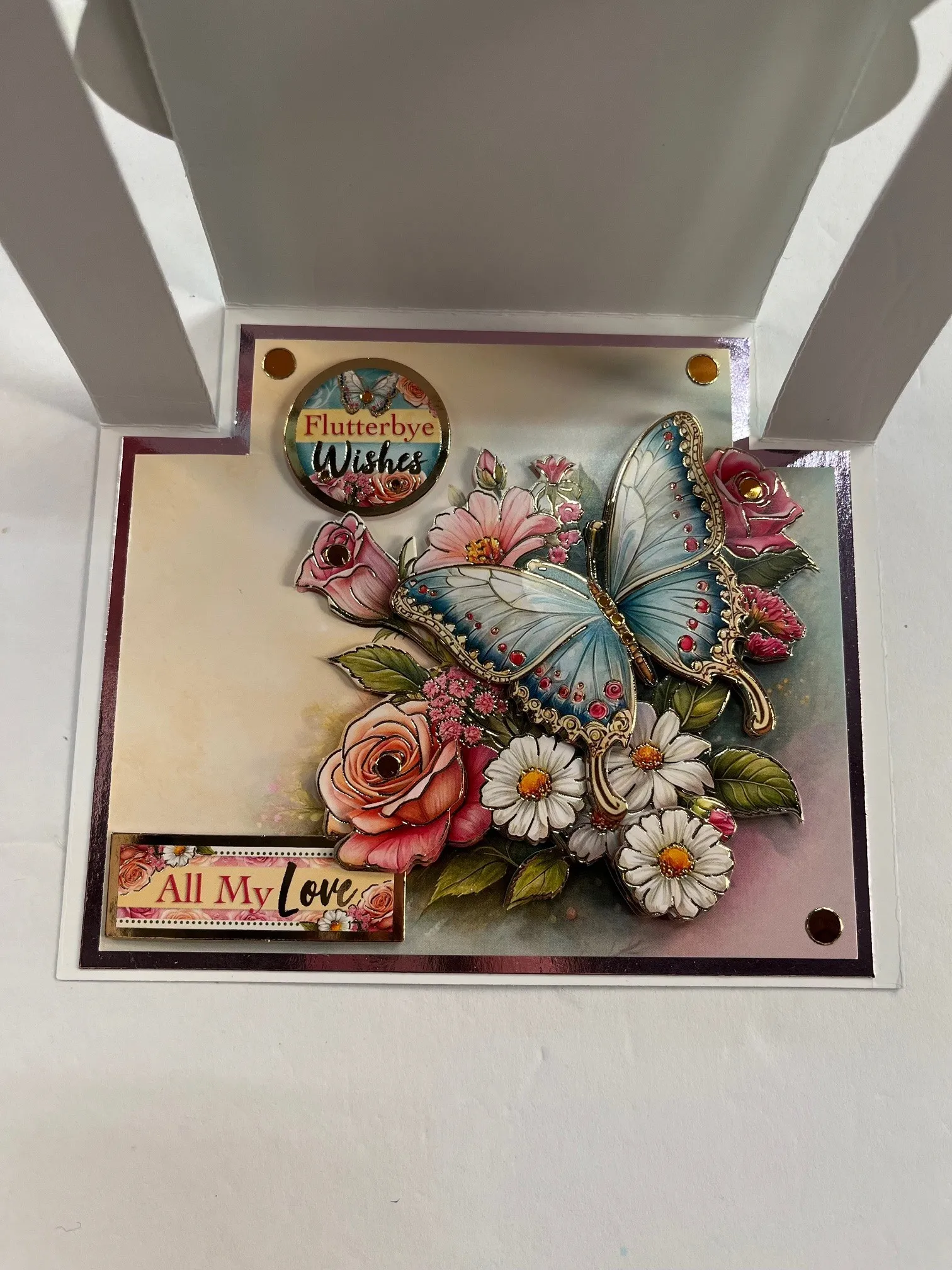 Card inside: Use the download pattern to cut the Adorable Scoreable with the the butterfly in the right corner. Mat on pink Mirri with 1/8” borders. Glue inside the card. Foam tape the circle “Flutterby Wishes” at the top left and the “All my love” at the bottom. Place copper Jewel Dazzles™️ in three corners, and on butterflies.