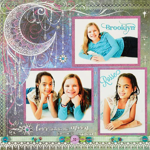 Place word Dazzles™ under the bottom photo. Place sparkle and hanging Dazzles™ as shown. Add a turquoise sequin to some of the sparkle Dazzles™. Add a button and pearl to the bottom star Dazzles™.