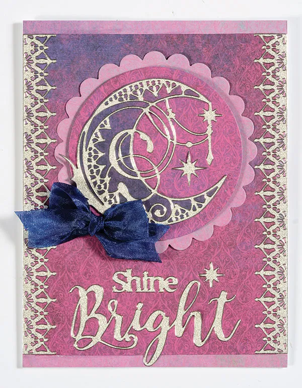 Use your die cutting machine and the circle/scallop cutting dies to cut a 3 1/4” circle from a dark pink area of the dark pink/blue flourishes paper. Cut a 3 3/4" scalloped circle from pink flourishes paper. Foam tape the dark pink circle centered on the pink scalloped circle. Glue it centered on the card, 5/8” from the top. Back the Dazzles™ large crescent moon on a dark blue area of the dark pink/blue flourishes paper. Add the moon centered on the dark pink circle.