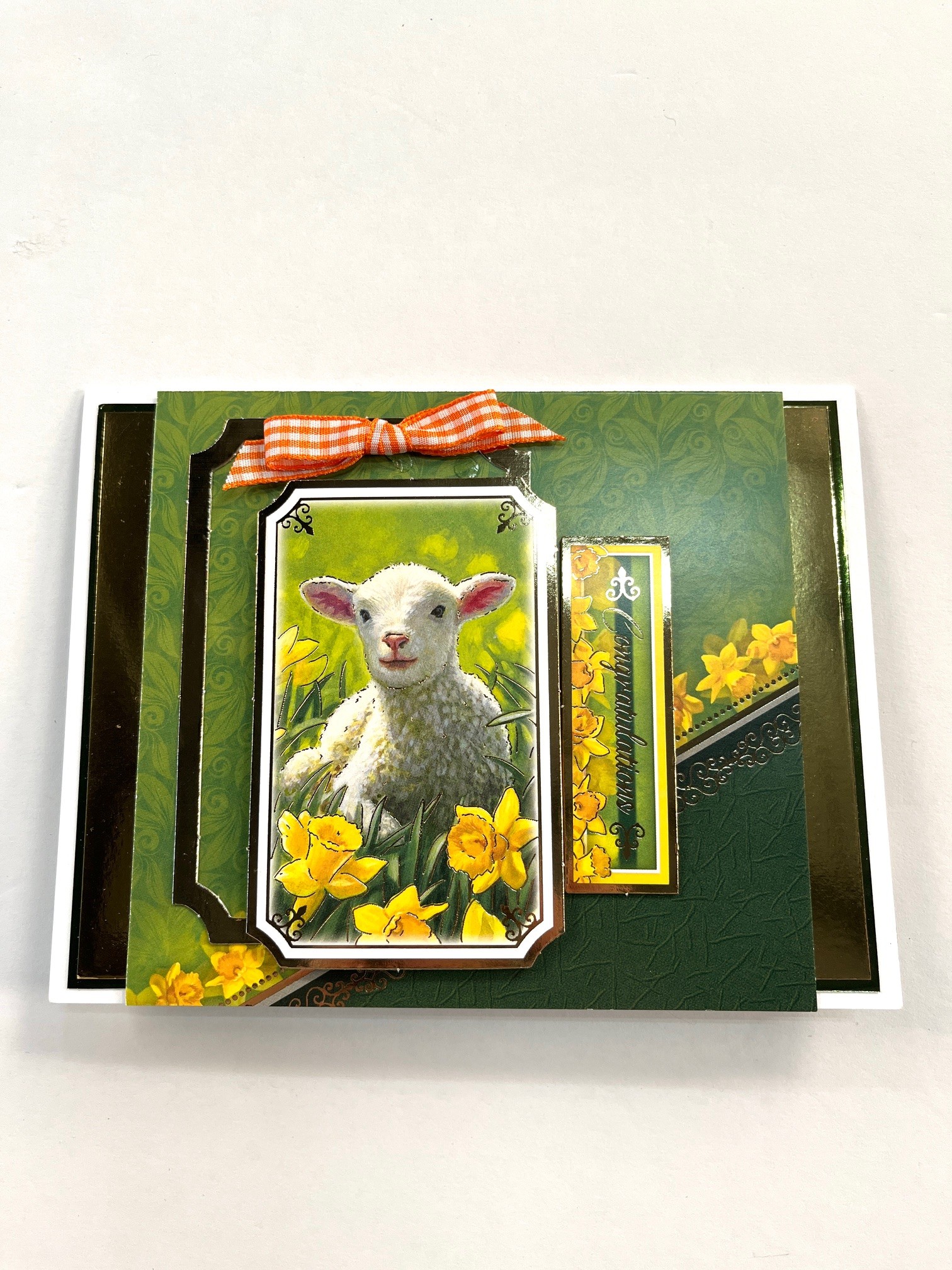 Cut 5 1/4”x5” Adorable Scoreable foiled corner treatment. Tape to the center of the card. Tape the frame from the lamb Topper 1/4” from all sides. Use a double layer of foam tape to place the lamb 1/2” to the right of the frame. Make and Zot™️ a 2” wide orange bow from the Gingham Ribbon Set above the lamb. Foam tape “Congratulations” to the right of the lamb on its side.