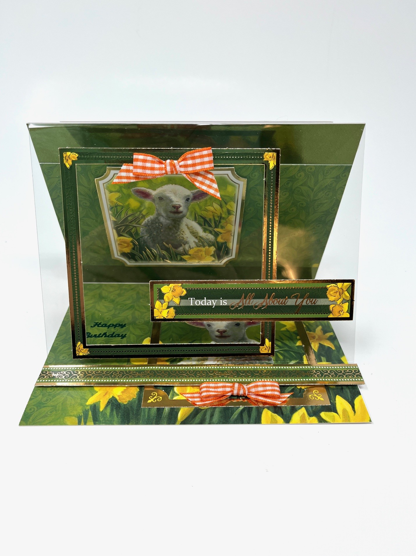 Inside top: Cut 6 1/2”x5 1/2” acetate and score at 5”. Place extra sticky tape acetate on the ½” tab and fold. Remove the liner and attach to the card. Cut a 6 1/2”x4 7/8” green Mirri and tape over the acetate tab. Trim off a 6 1/2”x3 1/4” of green background from the Adorable Scoreable and tape to the green. Foam tape the lamb Topper 1” from left.