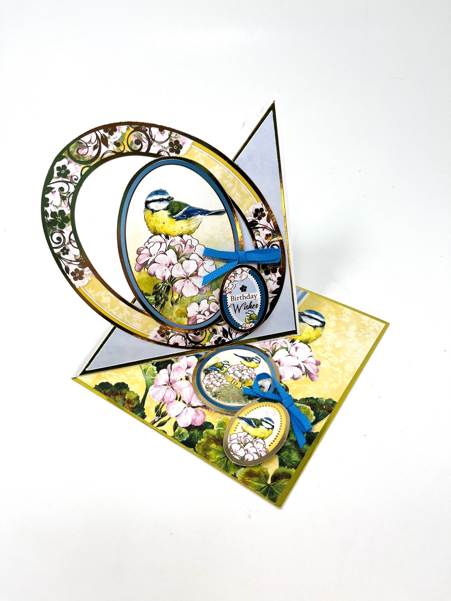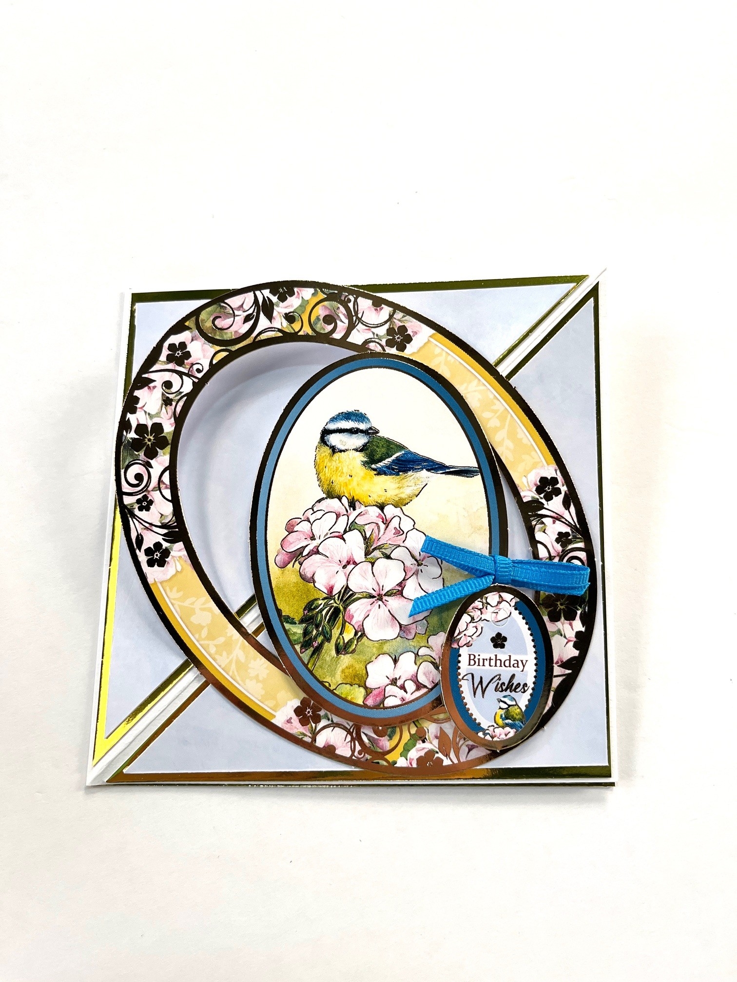 Create two Mirri triangles by cutting a 4 3/4” square and cutting along the diagonal. Tape to the card front leaving 1/8” white borders. Cut 4 1/2” square of blue Adorable Scoreable and tape to the gold Mirri leaving 1/16” white borders. Tape the bottom of the oval frame to the bottom card section only. Tape the oval bird to the bottom only. Foam tape “Birthday Wishes” to the right of the bird. Make and Zot™️ a 1” wide blue bow from the 1/8” Ribbon Set and place on top of the sentiment.