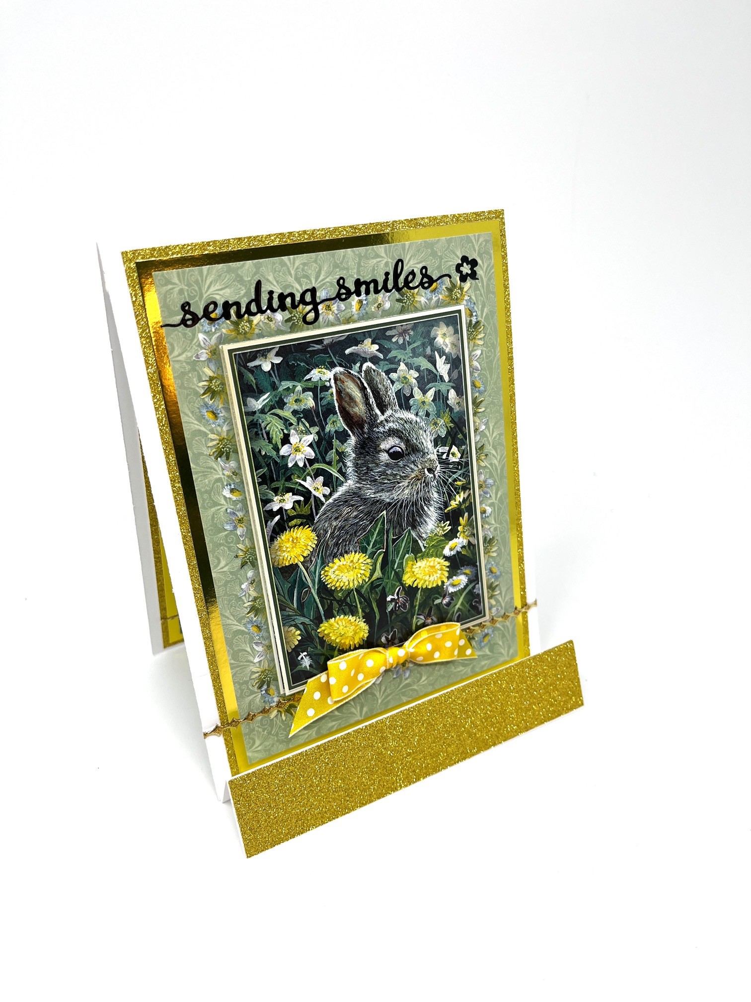 Card front: Cut out the inner bunny frame and foam tape over an identical page. Mat onto gold Mirri leaving 1/8” Mirri borders. Mat again onto gold glitter cardstock leaving 1/8” gold borders. Place gold Jewel Border Dazzles™️ 1” from the bottom of the card. Make and Zot™️ a 2” wide yellow bow from the Yellow Ribbon Set below the bunny. Place “Sending Smiles” Dazzles™️ at the top. Cut a 5”x1” gold glitter cardstock and glue to the front step.