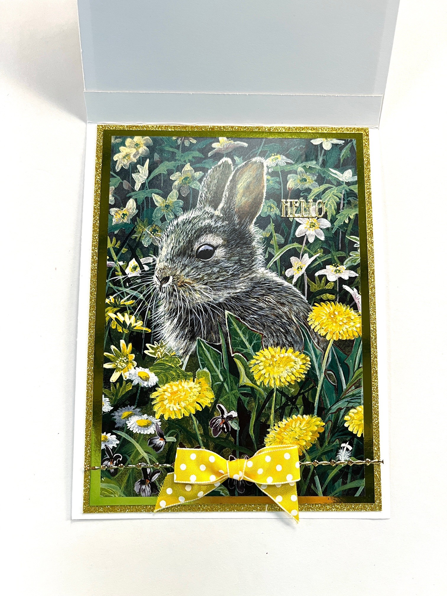 Card inside: Mat the bunny page to gold Mirri leaving 1/8” Mirri border. Mat again to gold glitter cardstock leaving 1/8” gold borders. Glue inside the card. Place border and “Hello” Dazzles™️ as shown. Make and Zot™️ a 2” wide yellow bow from the Yellow Ribbon Set in the middle of the border Dazzles™️.