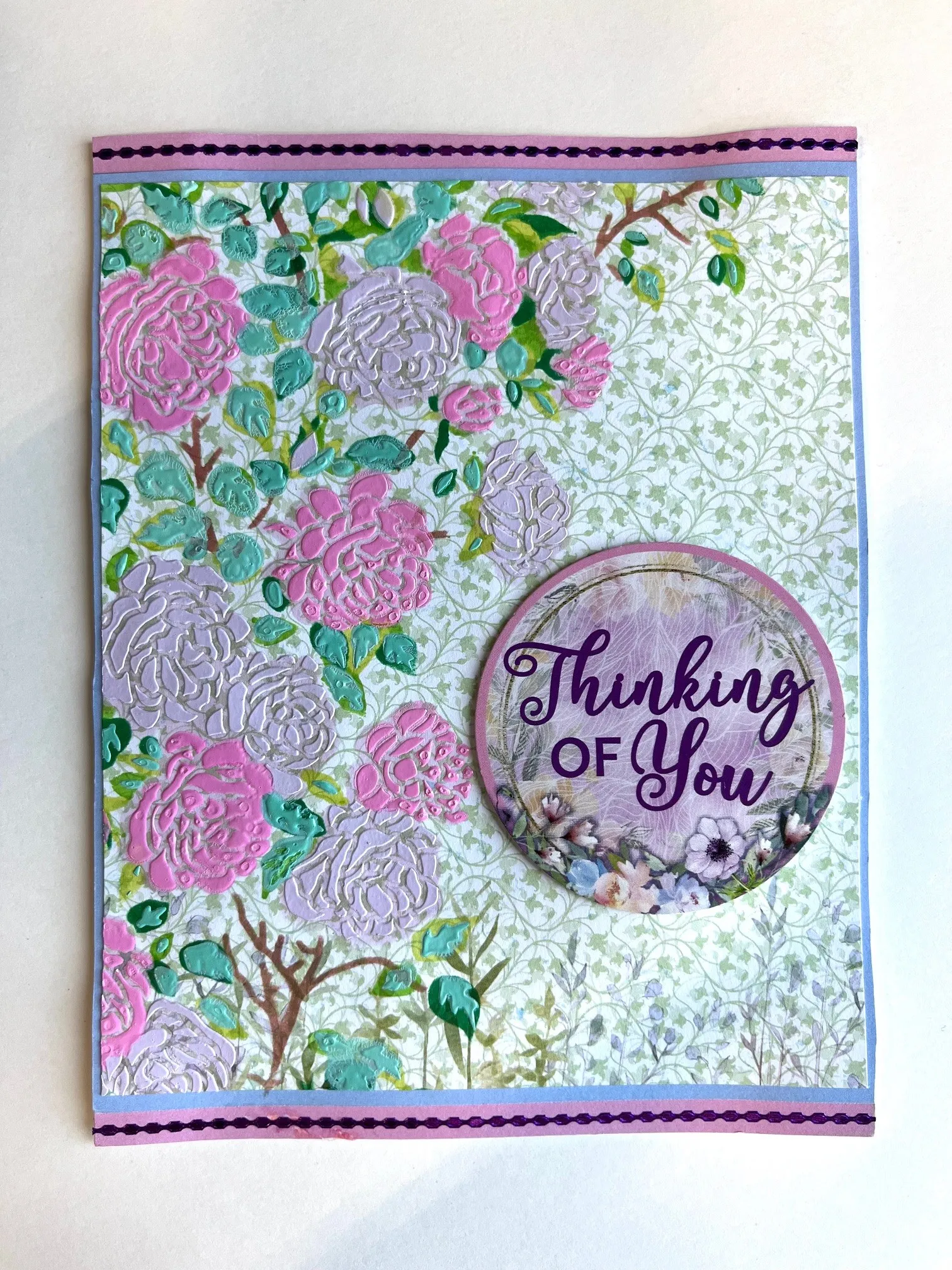 Tap Violet Ink on the craft mat 2-3 times to make a puddle of ink. Add some white texture paste and mix with the palette knife. Place stencil #3 on the Watercolor Wildflower leaf paper again and apply the lavender paste you have created with the palette knife. Let the paper dry and wash the stencil.