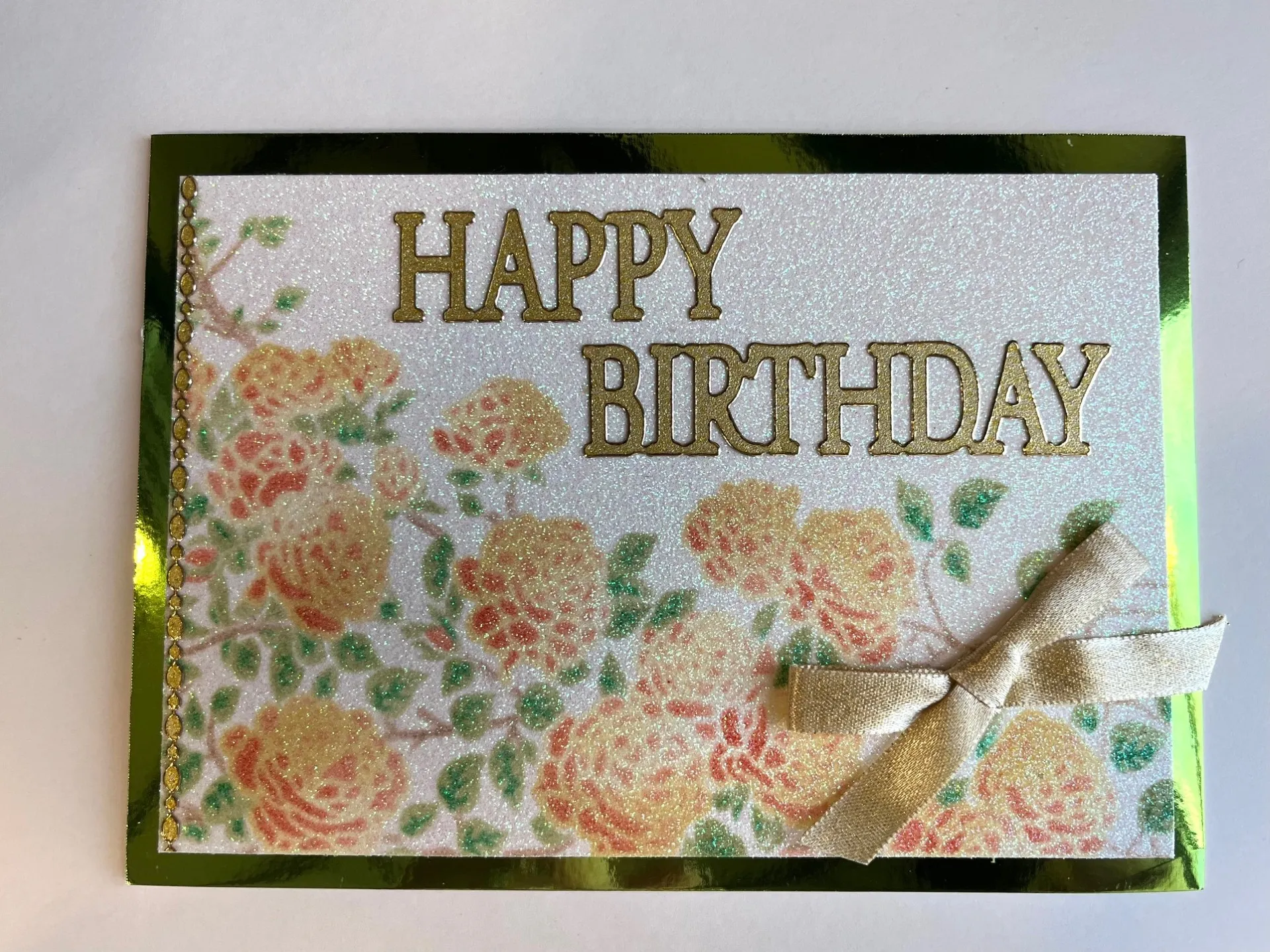 Tape stencil #7 to the glitter cardstock corner and apply Velvet Fawn ink to the rose stems. Remove stencil