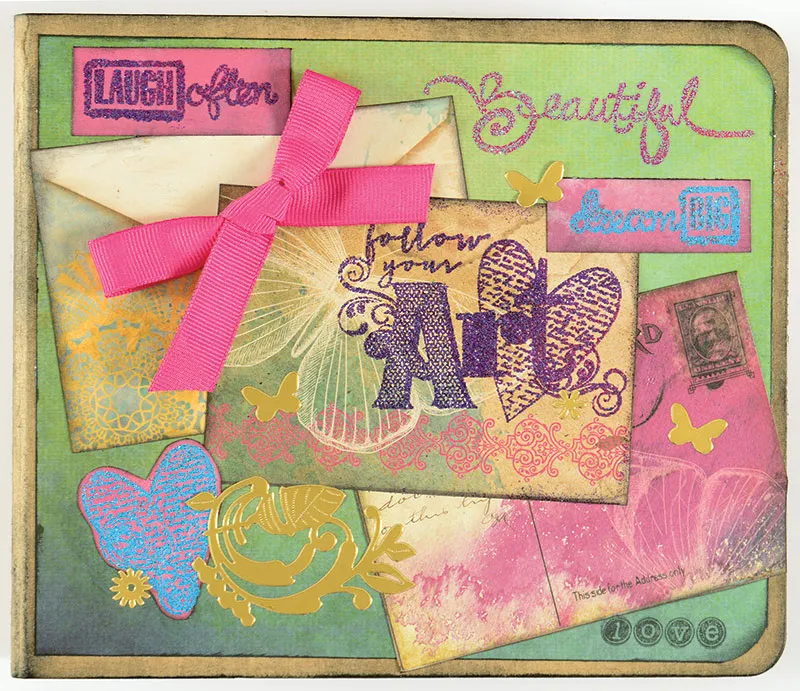 Place Gold Artful Affirmations Dazzles™ swirl leaves and flower near the hearts and butterflies among the post cards as shown. Use a length of ½” wide dark pink grosgrain Artful Watercolor Ribbons to make a bow and Zot™ to the binder as shown.