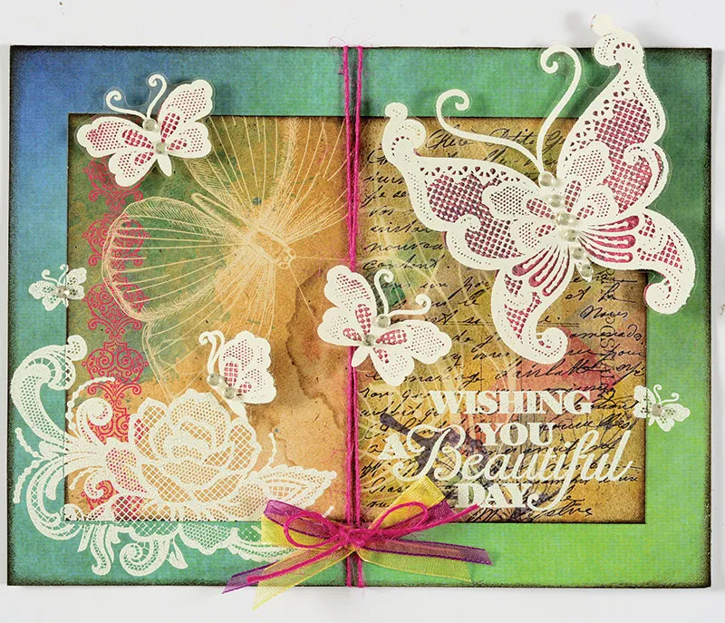 Use VersaMark™ to stamp a large rose cluster at the bottom left corner. Dust with white embossing powder, shake off excess and set with the heat gun. Stamp and emboss “Wishing You A Beautiful Day” on the bottom right corner of the postcard piece. Stamp and emboss two tiny butterflies as shown.