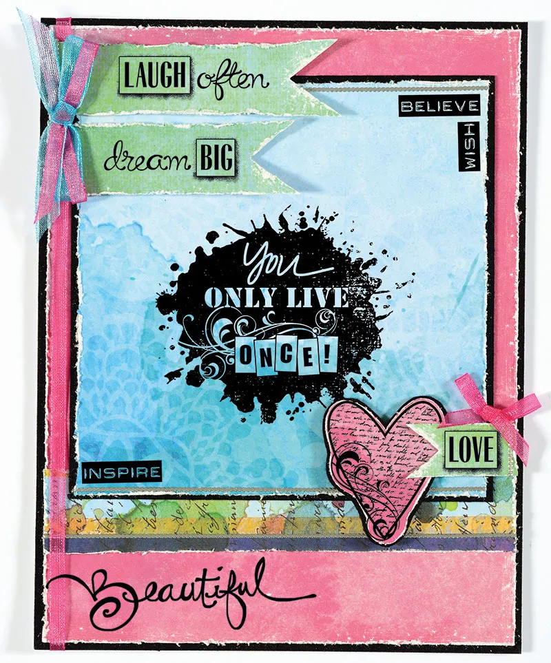 Stamp “You Only Live Once!” centered on 4 ¼”x4 ¼” blue paper, sand the edges and place thin line Dazzles™ 1/6” from the top and bottom. Stamp “Believe&rdquo,; Wish, and Inspire as shown. Mat on black suede with a 1/16” border and glue ½” from the top. Wrap 1/8” pink sheer ribbon along the left side, tucking the ribbon ends under the suede paper.