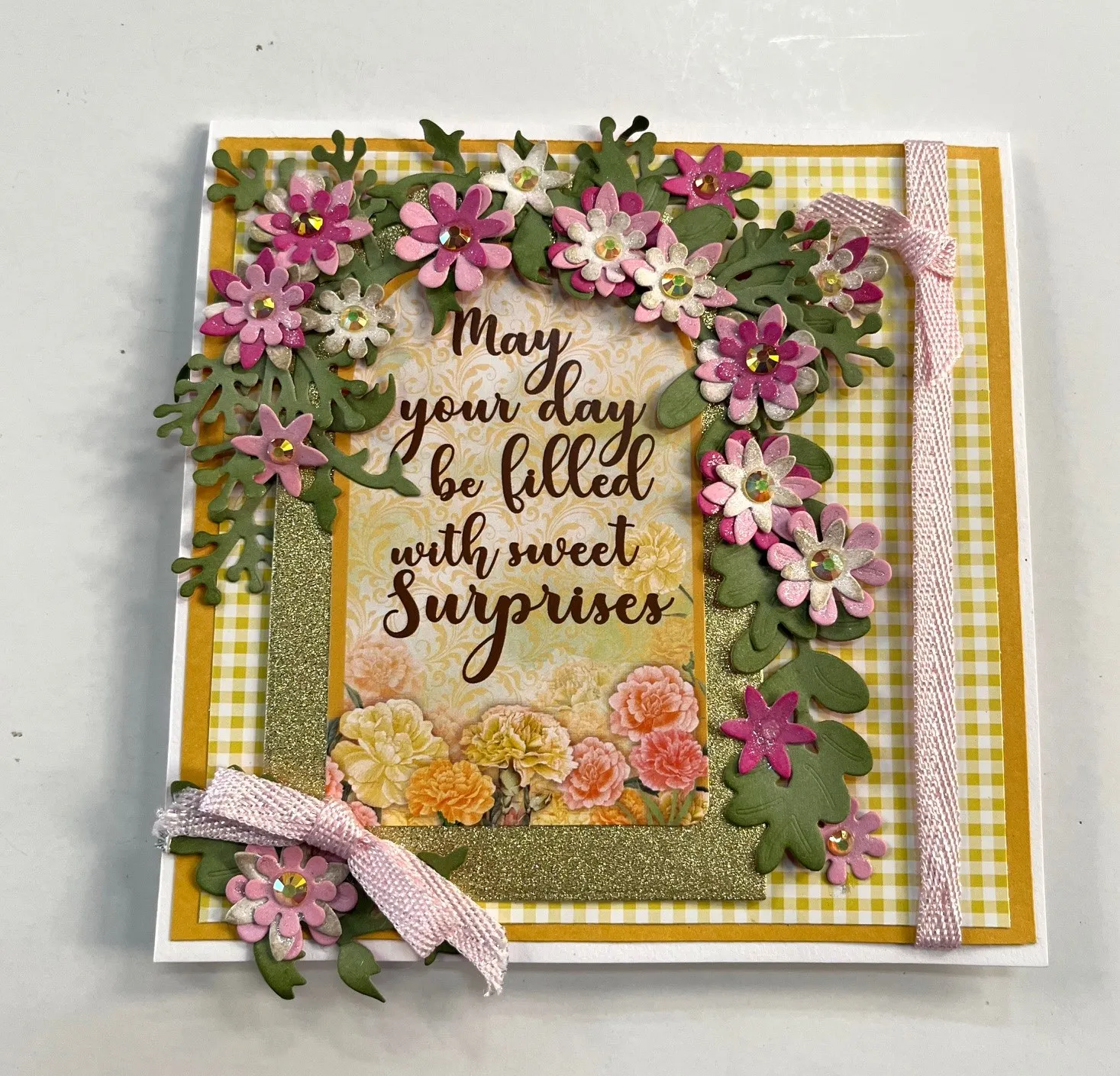 Trim a white blank card down to a 5x5 card base with the fold at the top. Cut 4 3/4" square of yellow cardstock from the Carnations 12x12 Solid Cardstock and secure to card base with mono adhesive. Cut 4 1/2" square yellow gingham paper from the paper pad. Cut a 5 1/2" length of pink ribbon and secure to the back with mono adhesive 1/4" from the left side. Secure the gingham paper with mono adhesive leaving a 1/8" yellow border. Cut 2” ribbon length and tie a knot onto the ribbon 1/2" from the top.