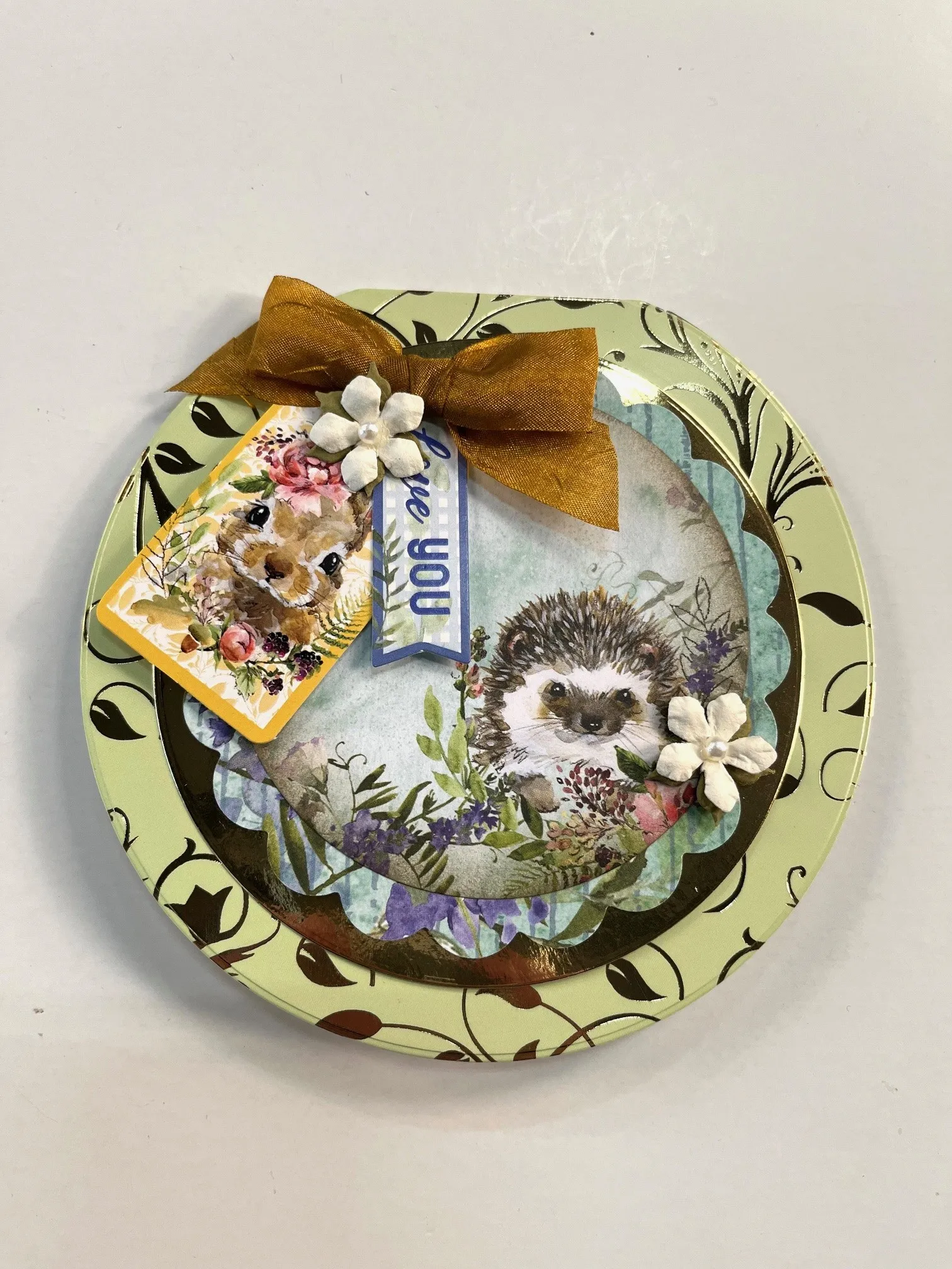 Die-cut the next scalloped die out of the Wildflowers & Wildlife 12x12 Patterned Cardstock and foam tape to the center of the Miri. Die-cut the next circle out of the sheet of 6 greetings featuring the hedgehog. On a craft mat use a blender brush and Muddy Boots ink pad to go around the circle edge. Glue this circle to the center of the scalloped circle. Use foam tape to secure the bunny tag Die-Cut to the top left. Glue the "Love You" Die-Cut to the bunny tag as shown. Make and Zot™ a 2" gold bow at the top and glue an ivory flower below the bow. Glue a flower at the bottom by the hedgehog.