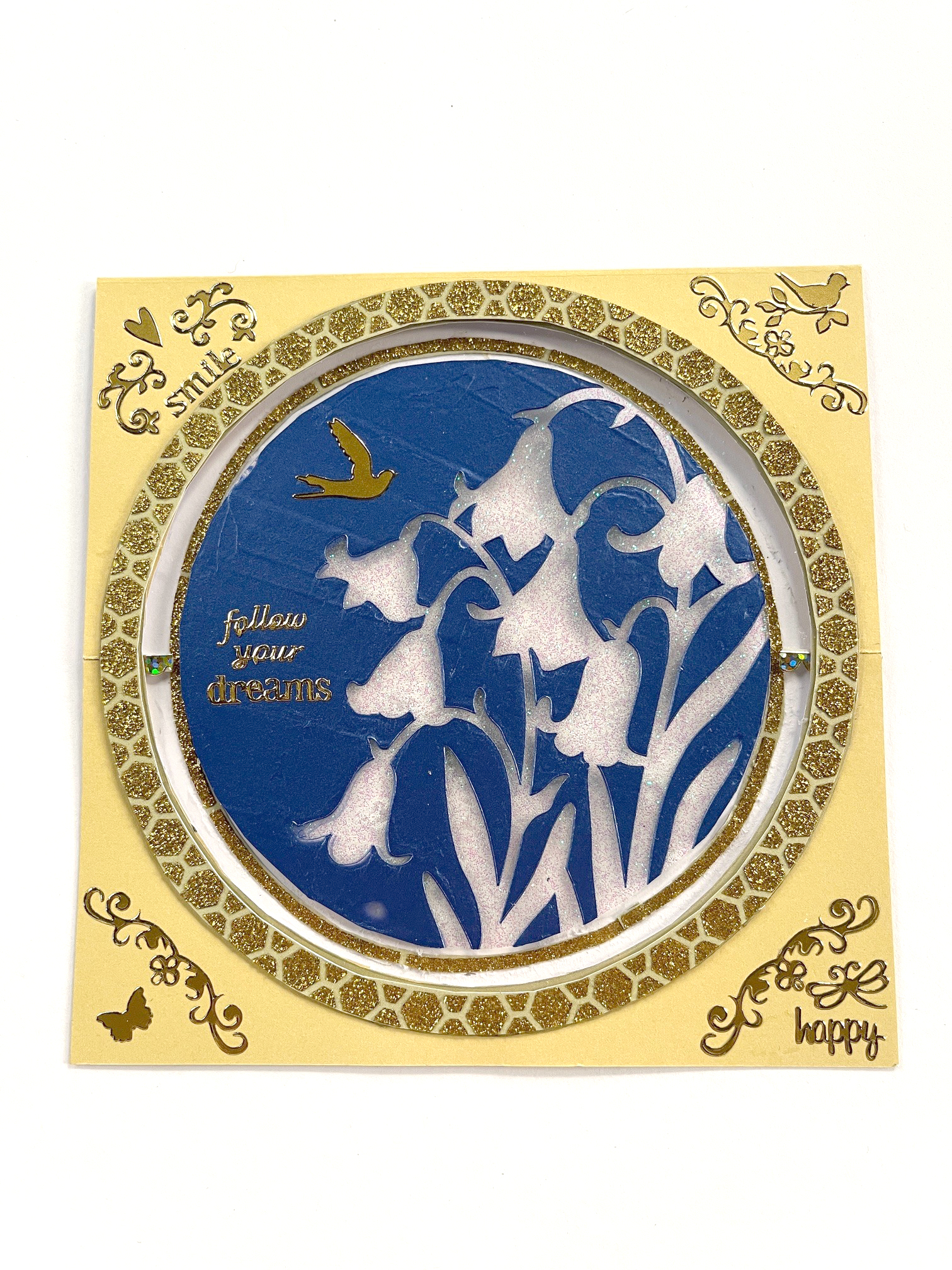 Cut a 6” square of light green solid cardstock. Place the stencil on the cardstock. Spread the Slippery When Wet Astro Paste over the stencil concentrating on the outer edges. It does not matter if you go out of the lines, you will be cutting this. Let Dry. Once dry, cut the 2 circle pieces out. Place the outer frame on another 6” square of cardstock. Trace and cut another circle frame. The middle circle will be very thin. Place pieces of extra sticky tape on the back of the larger circle. Adhere it to the acetate piece with the stenciled Bluebell circle, centering it around the bluebells, and leaving a 3/8” gap between the circles. Repeat with the 2nd circle frame, adhering it to the back of the acetate, forming a frame around the stenciled circle. Trim the acetate around the outside edge to form a circle. Set aside.