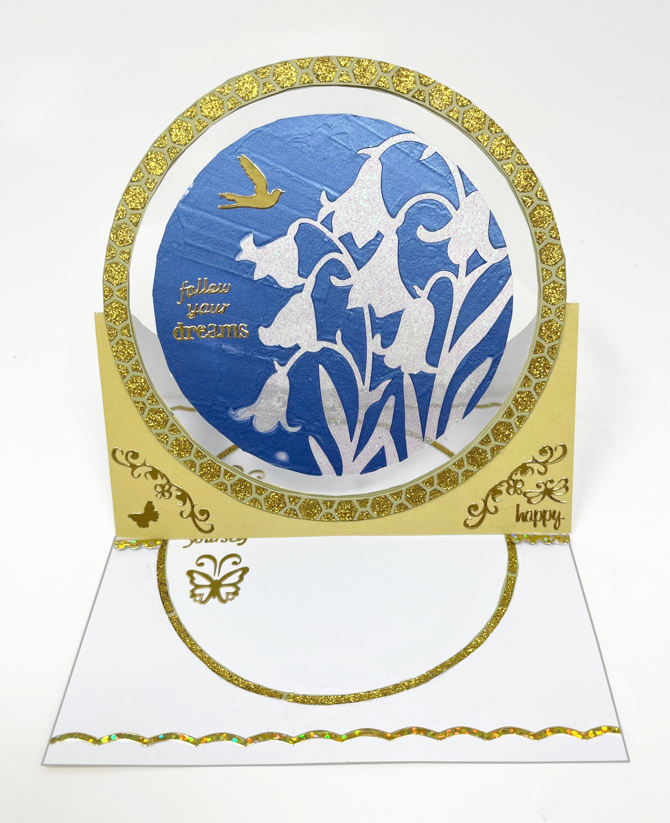 Cut a 12”x6” yellow/white solid cardstock, and score and fold at 6” to form a 6” card. Score the card top only at 3”. Place the fold at the top. Place the stenciled acetate circle frame you have made on top. Lightly trace around the entire circle. Use a retractable knife, or scissors to cut the circle ¼” inside the traced line. Glue the acetate circle to the card placing glue only below the score line, and placing glue only on the outside frame. Fold on the score line, creating an easel card. Glue the thin gold circle on the inside of the card centered around the middle blue denim circle, so it shows through the window when the card is closed.
