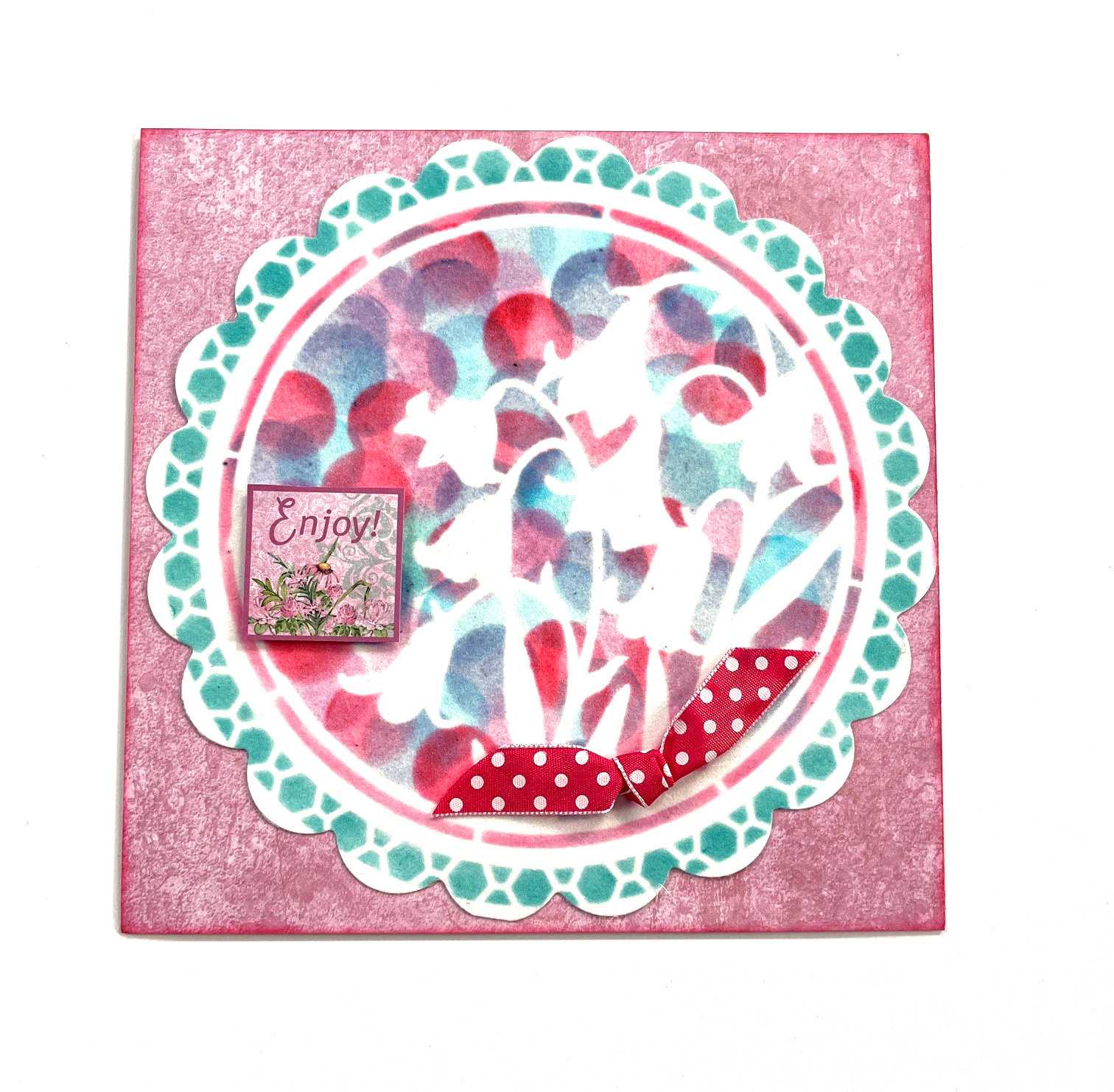 Cut out image using largest scallop cutting die and glue to covered 6”x6” card.