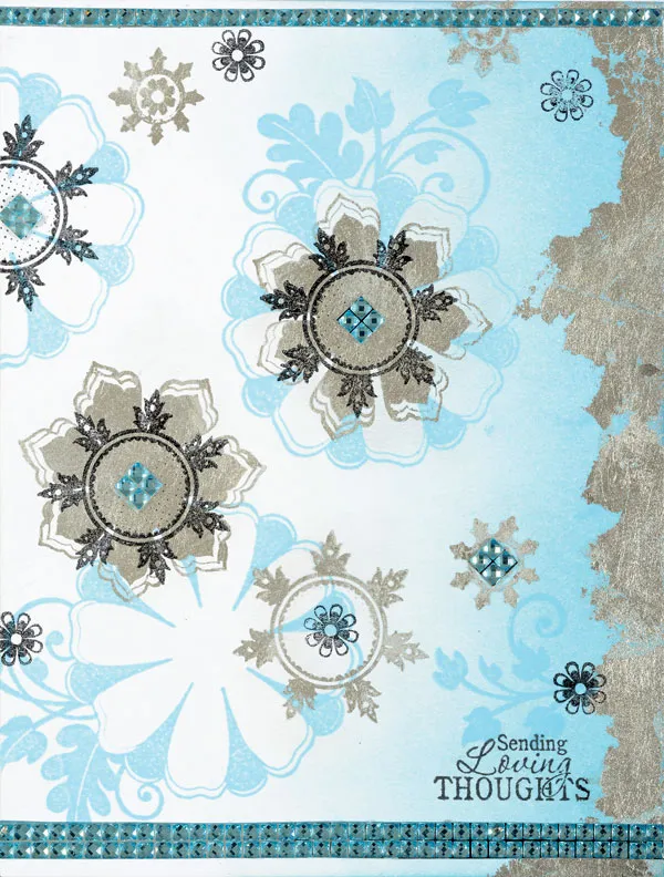 Working with one stamped image at a time, using Sea Crystal ink, stamp the Kindred Spirits solid flower randomly on the card as shown. Place Metal Leaf over the stamped image and use your fingers in a circular motion to rub off the excess (save excess for future projects). Repeat the process with smaller stamps until desired look is achieved.