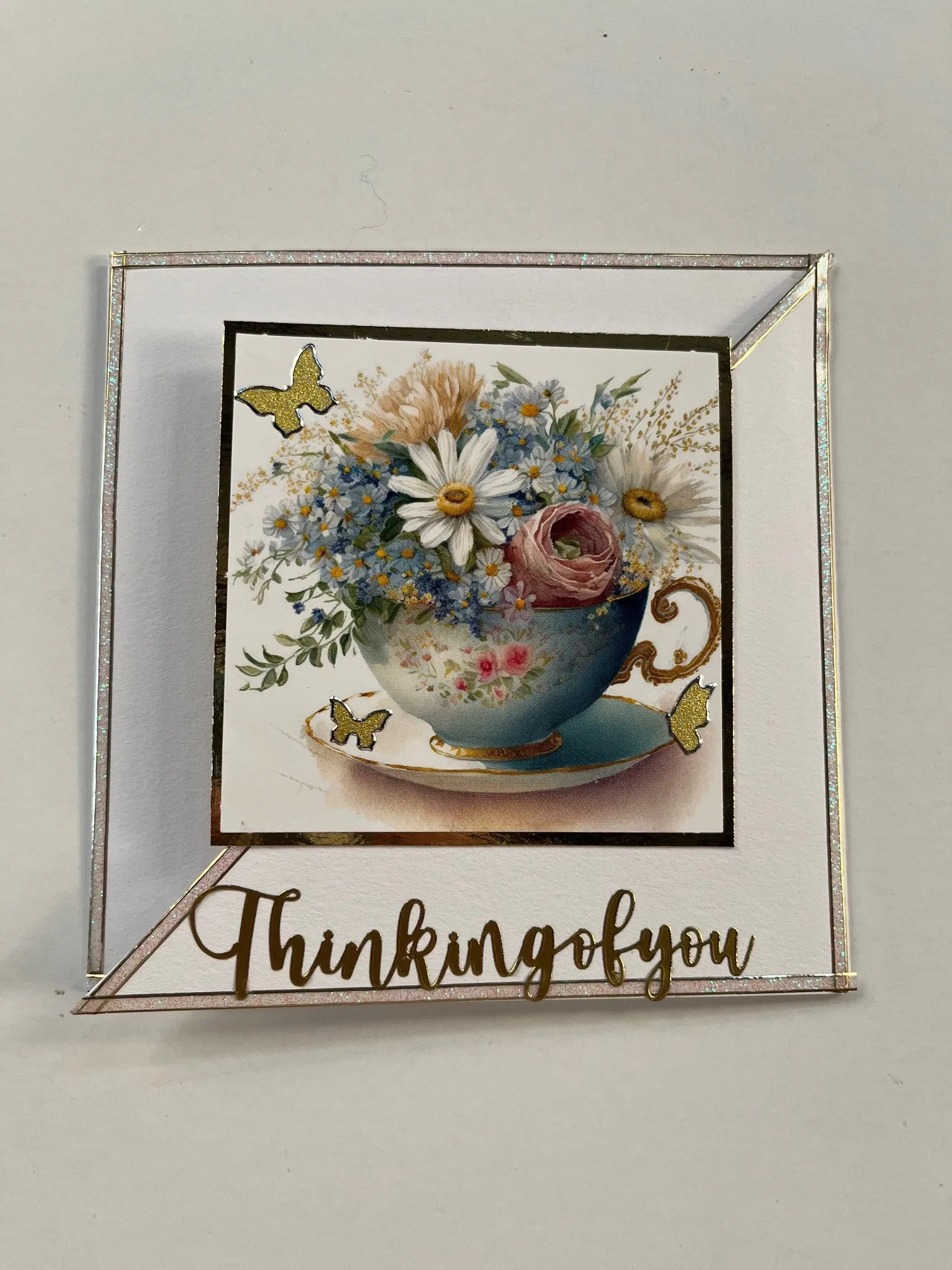 5. Inside: Cut 4 ½” square teacups Whispering Spring paper. Mat on gold mirri with 1/8” borders then glue inside the card. Place Wide Straight Line Dazzles™ along the edges. Place “Love You” We’re Together Dazzles™ at the bottom with one Gold Pearl Butterfly as shown.