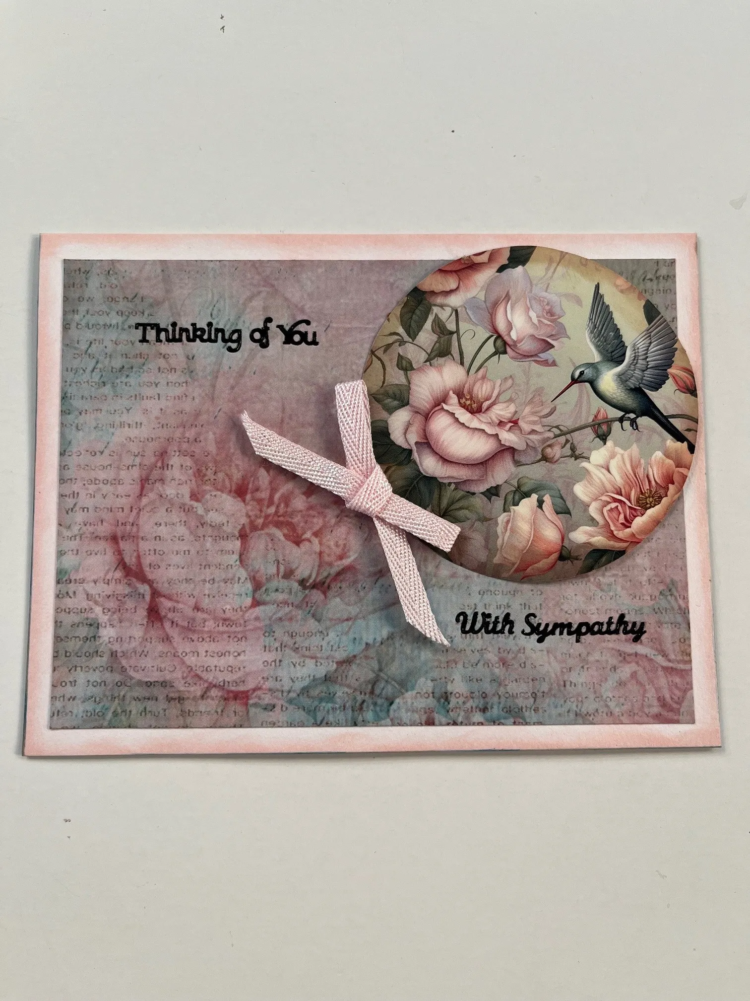 2. Holding the Bird Round Die-Cut apply Velvet Fawn ink pad around the edges so the ink also shows on the front. Foam tape to the card just going outside the paper edge. Place “Thinking of you” and “With Sympathy” Tiny Words & Phrases Dazzles™ stickers as shown. Tip: If some areas in the letters do not pull off, use the Pen Knife to lift them after you’ve placed the words.